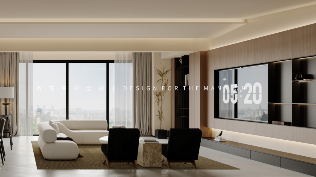 在软装搭配上,天然材质的纯色地毯与定制柜和墙板呼应,如同风衣的卡其色和大衣中的驼色,中性色彩于上乘材质的组合,是永不过时的经典。