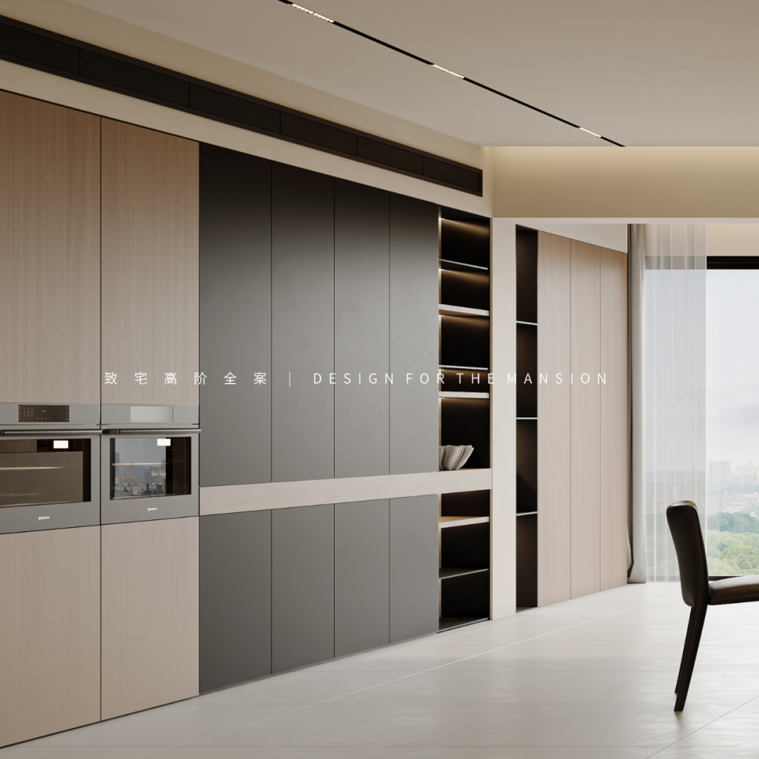全墙定制柜体是餐厅的绝佳背景板,蒸烤箱、直饮机和嵌入式冰箱都为餐岛区扩容,不锈钢开放格和灯带的组合是氛围利器,艺术餐厅徐徐展开。