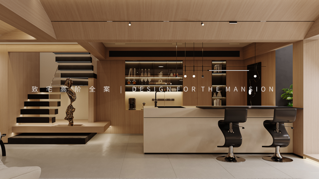 墙内预埋钢管打造的悬浮楼梯,与跟随灯带,本身就是一种装饰。交错的地台和小雕塑,都为家庭酒吧增加了不少氛围,这里也可以作为临时座位使用,一举多得。