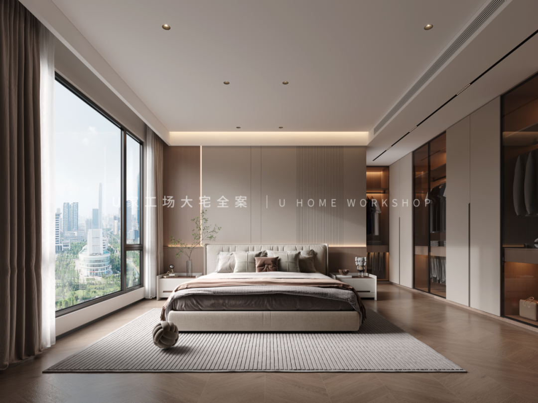 睡眠空间布局由比例柔和而精准的细节主导,无论是背景格栅饰面造型、软装颜色上都完美协调呈现出独特而现代的设计风格,给主卧增添惬意与舒适感。