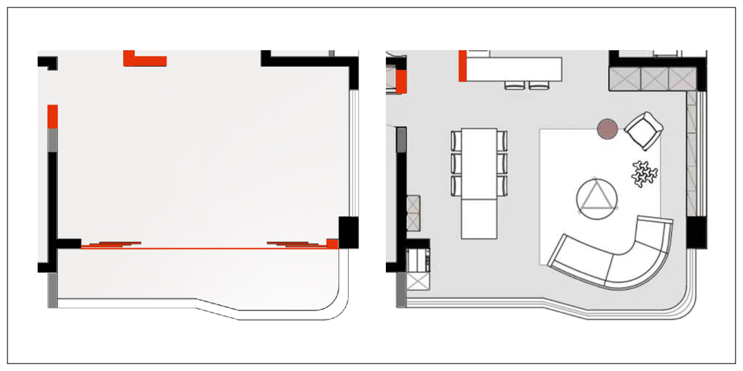 170的原始户型方正,端厅270°的视野采光极佳,整体公区可利用空间大,但全屋户型的可储物空间却比较局促。因此设计师针对公区进行了3组洄游动线规划,打造“不走回头路”的环状布局,连接客餐厅、卧室及儿童房。