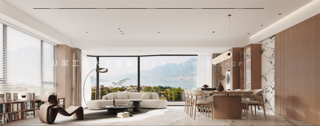 理解屋主想要营造家庭学习和互动氛围的基本诉求后,设计师打破了传统公区概念,采用“去电视化”洄游设计动线把阅读、休闲交流等日常行为在空间中形成了一个渐进序列。