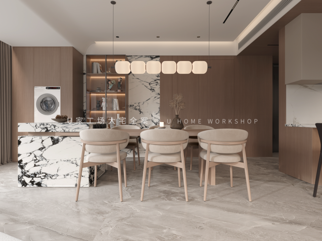 柴米油盐的琐碎日常便是生活的艺术。餐岛区与客厅视觉一体化融合,结合生活便捷性的同时也充分考虑了家人间的交流互动性。