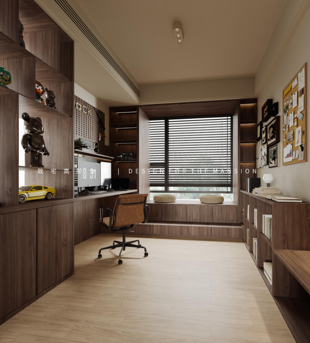 书房配备了收纳柜与展示柜,可以用于是日常的使用,另外考虑到收纳电竞设备,特别添加了洞洞板,可以随心所欲的安置屋主的热爱。