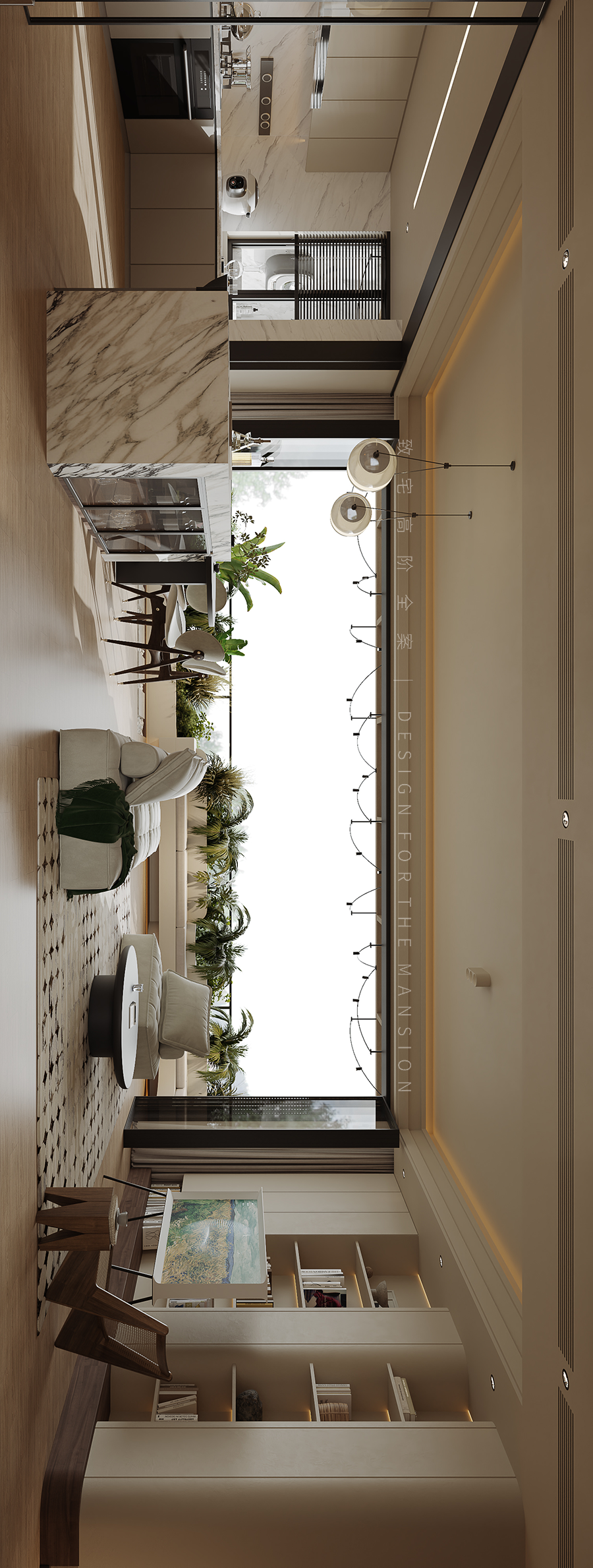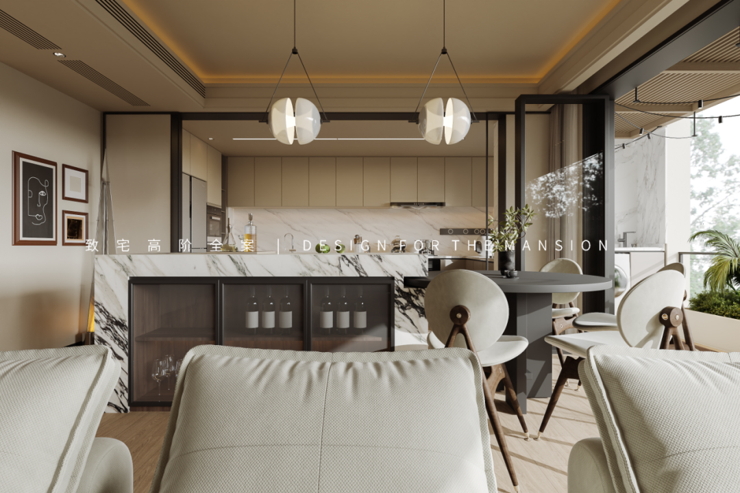 在餐厅部分加入大中岛,奢石的天然纹理提升了空间的审美格调,但不只是极致的美感更是功能的满载。