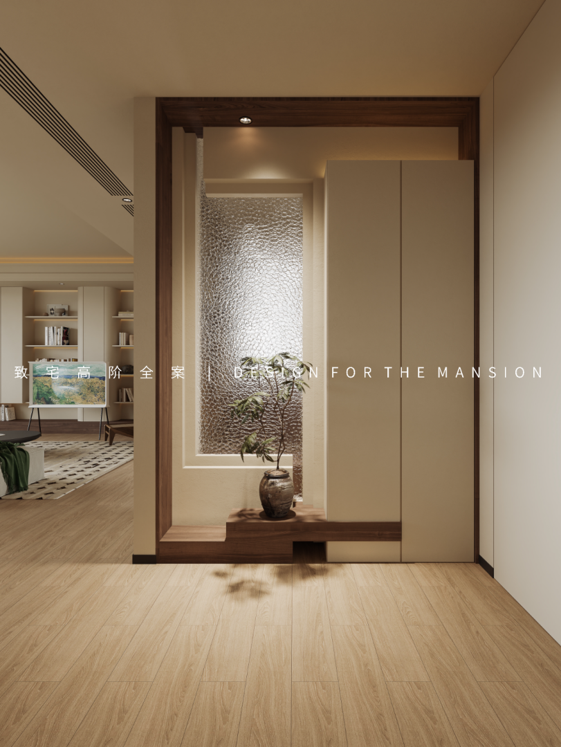 设计师在玄关处设置了端景造型,加入荔枝纹玻璃来达到光线的交互,为玄关引入更多自然光的同时也营造出朦胧的美感。