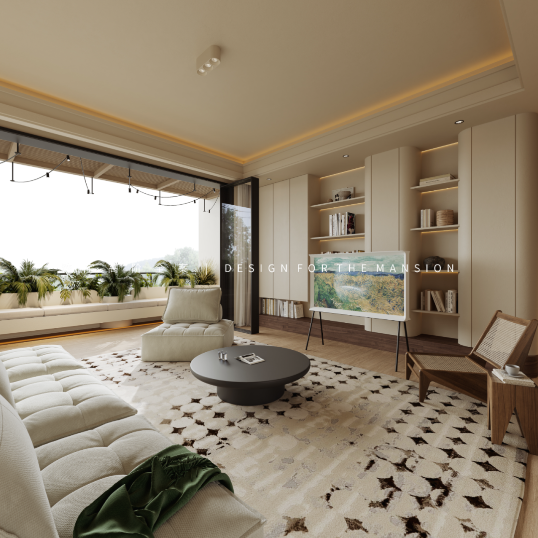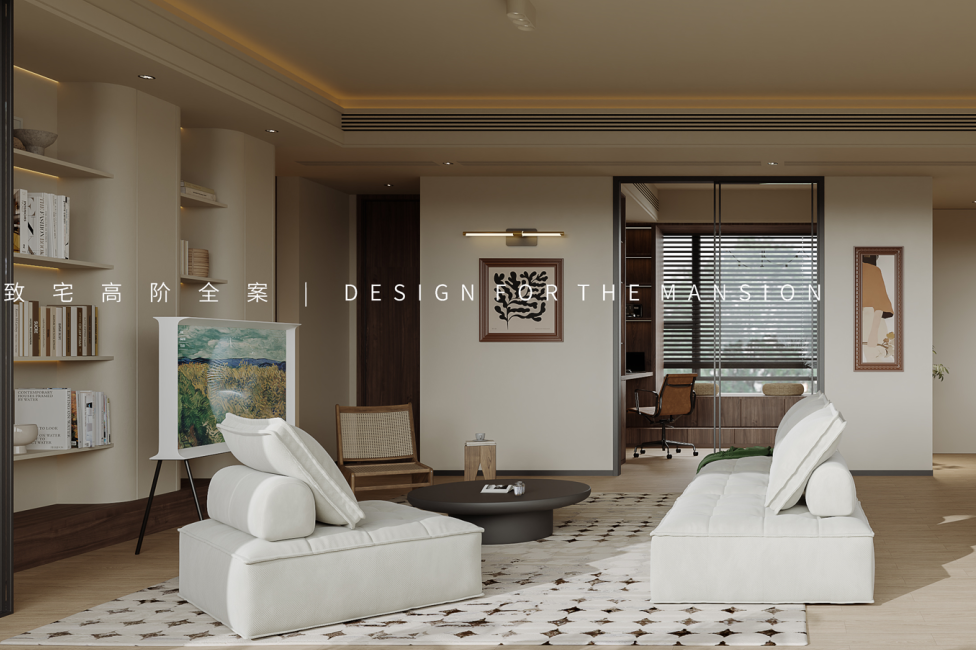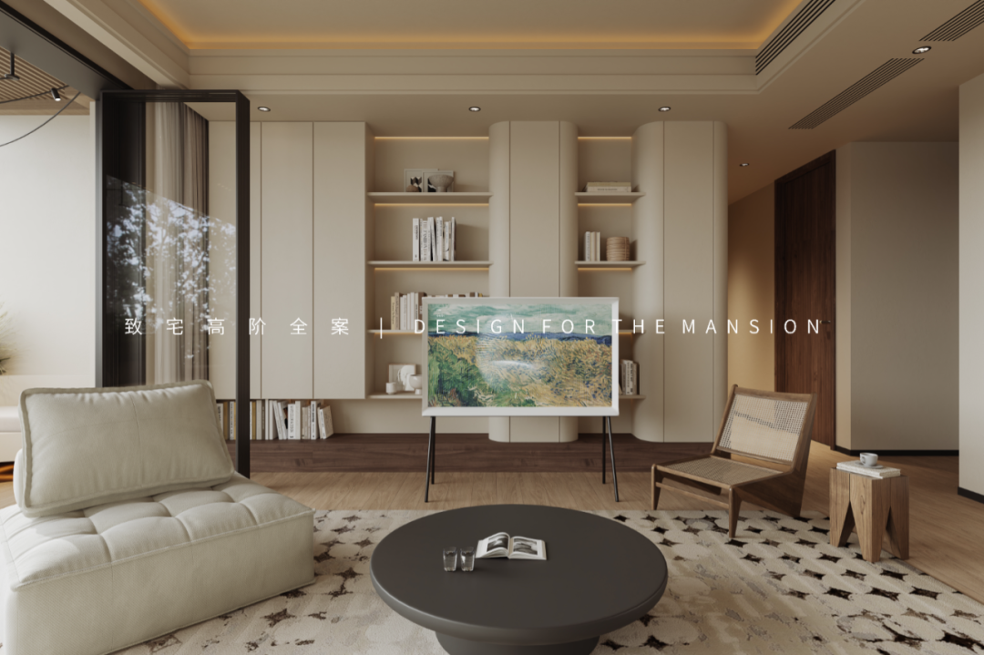 圆弧的设计元素也让空间有趣的同时让视觉更加柔美,搭配画镜电视,既有个性也让观影的自由都更高。