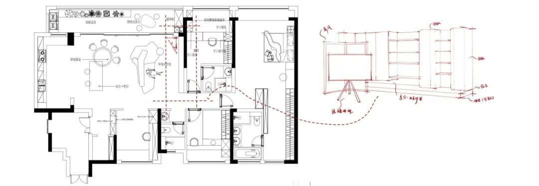 屋主希望客厅可以不再是单调的观影围坐,而是可以成为一家人最多交互的陪伴空间,于是我们摒弃了传统电视墙的设计,将电视墙设置为更赋予意义的区域。