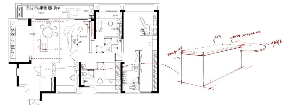 圆桌与岛台的咬合设计,能满足不同人数的用餐需求,天气好的时候,还可以把圆桌拉到阳台用餐。