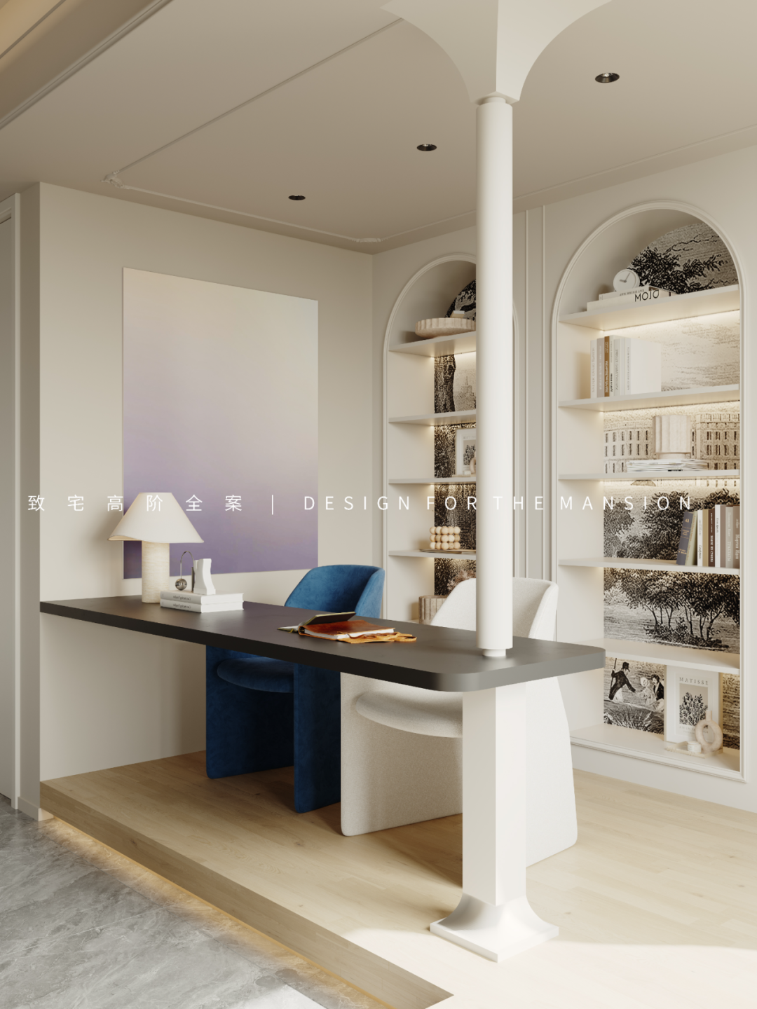 拱形元素的加入,让空间的视觉更加柔和,搭配黑白背景,这里既是收纳空间,也是这个家的情感空间,慢慢变旧的彩色绘本,一年一次的全家福,摆放的每一件都是属于她们的独家记忆。
