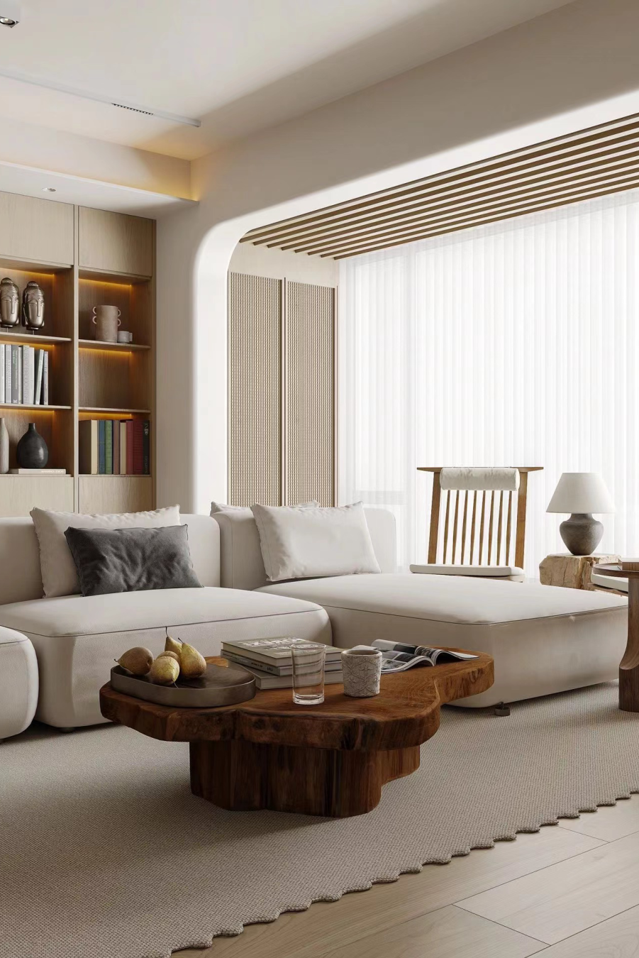 在主方案中,我们取消客厅茶几,让渡整个客厅空间打造游乐区,使用整墙书柜营造阅读氛围。