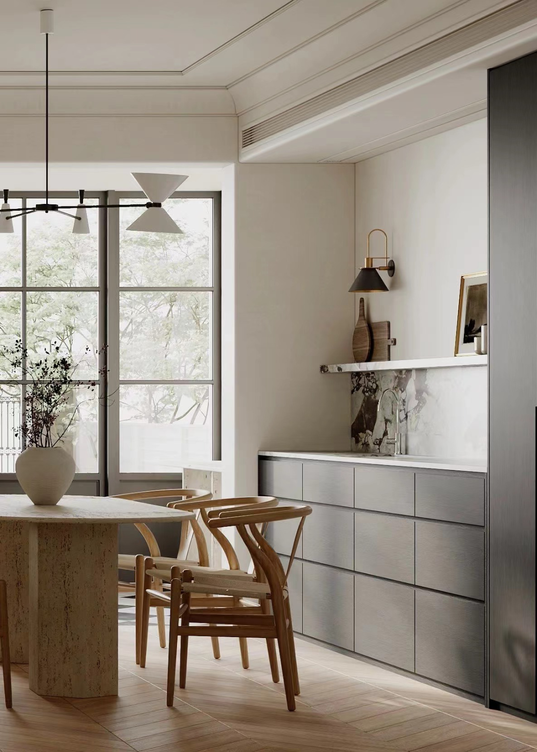 餐厅尺度有限,设计师特别选择无吊柜的餐边柜作为收纳补充,减少满墙柜体的压迫感。