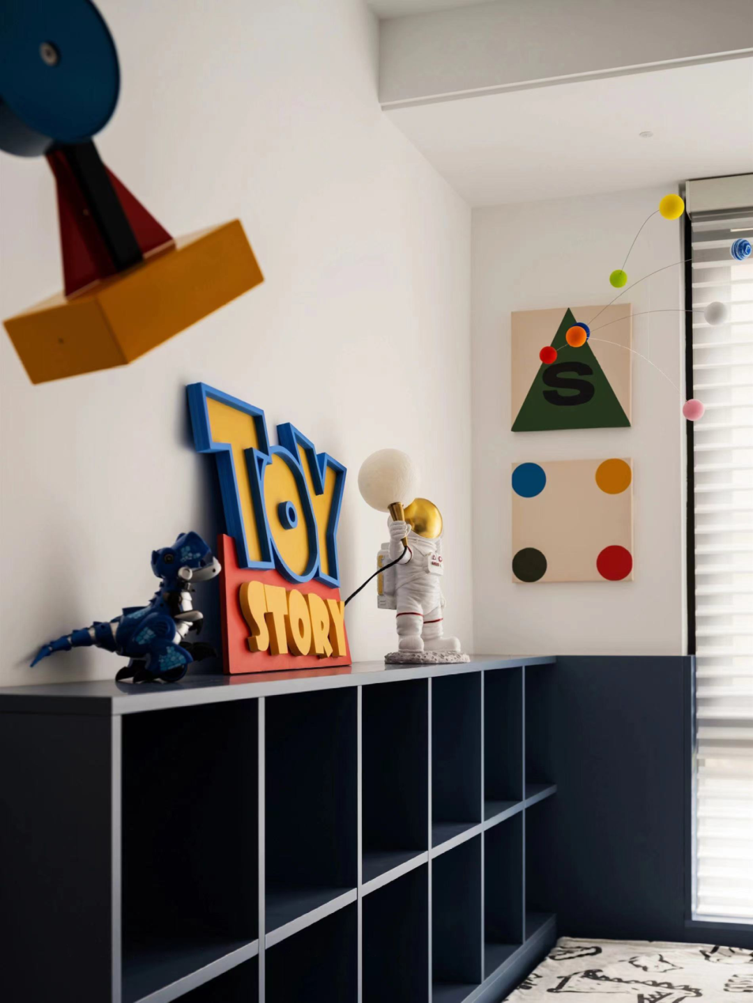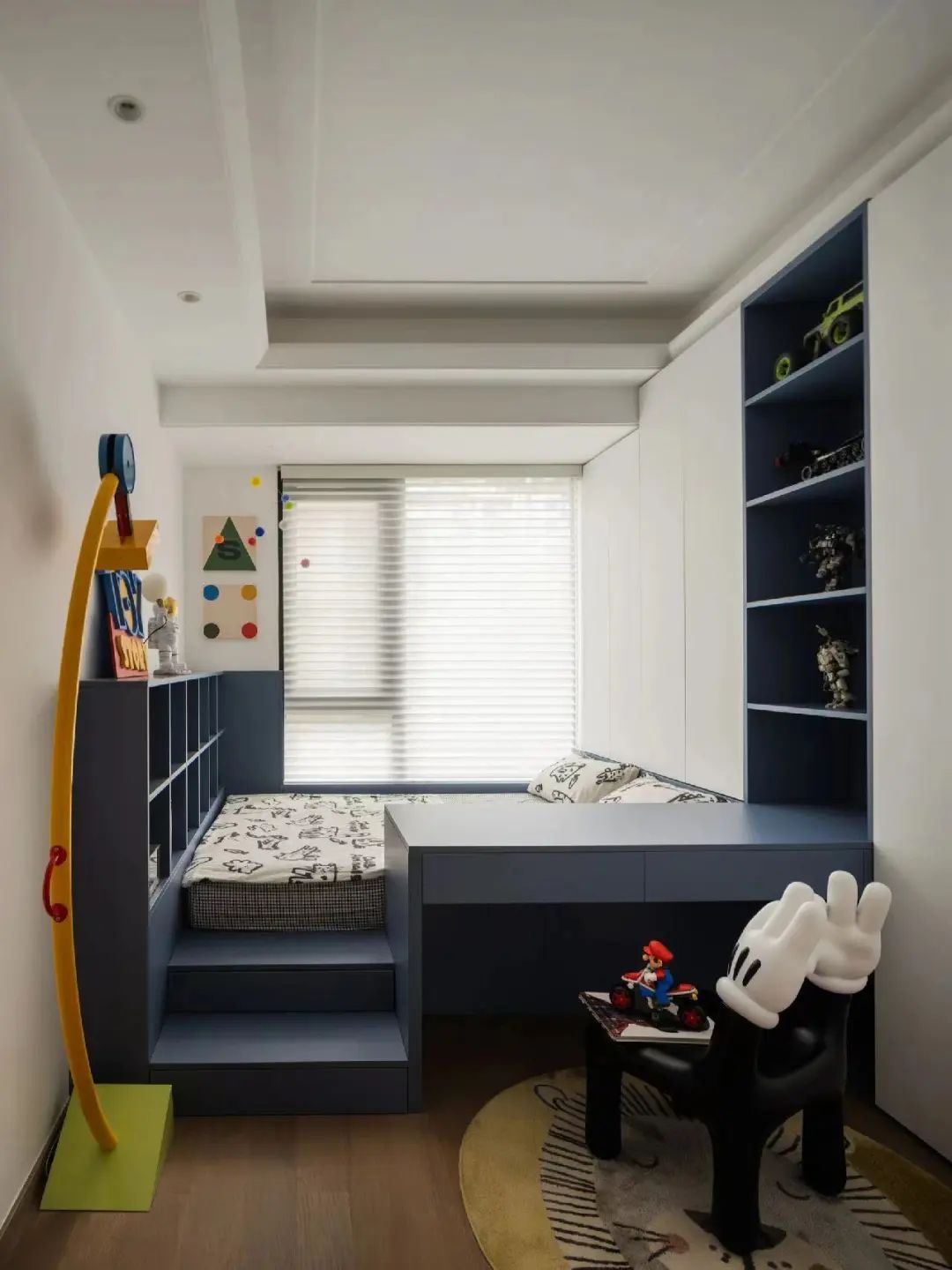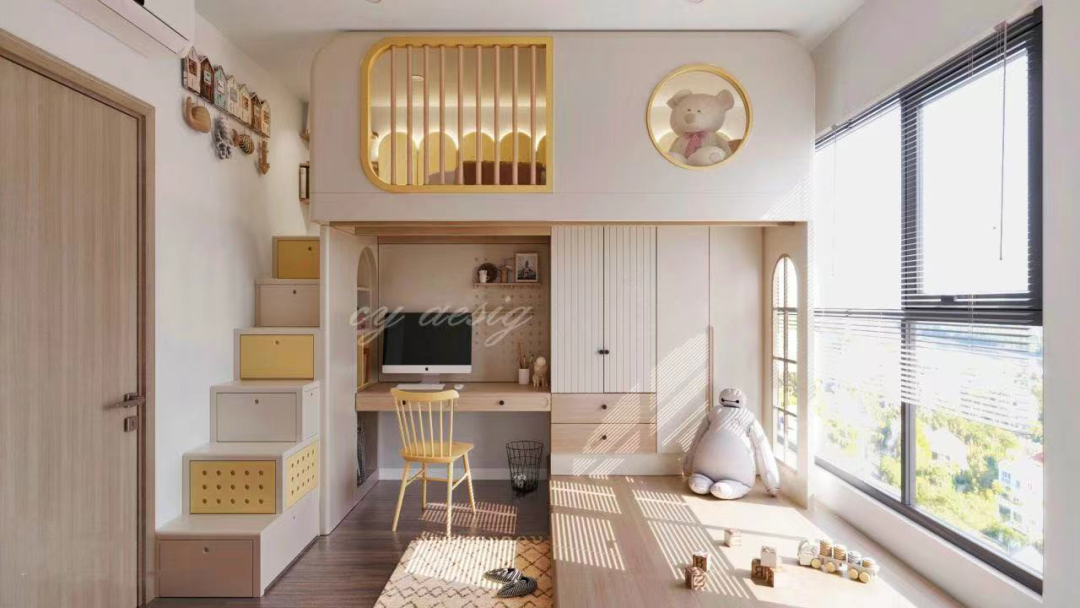 另一种解决方案是通过全屋定制,设计为睡眠、娱乐、学习、收纳于一体的上下组合家具,同时实现地面玩耍和上床睡眠。分区满足孩子的成长需要,尽可能地利用设计来平衡空间与孩子的成长关系。