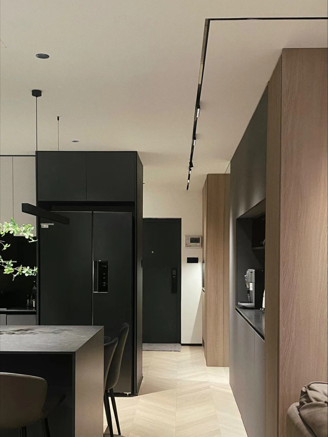 对于不想冰箱太远的邻居,我们也给出了以冰箱为隔断的解题思路,通过折叠门与冰箱找平,形成统一视觉。