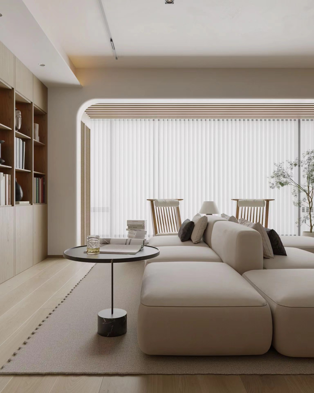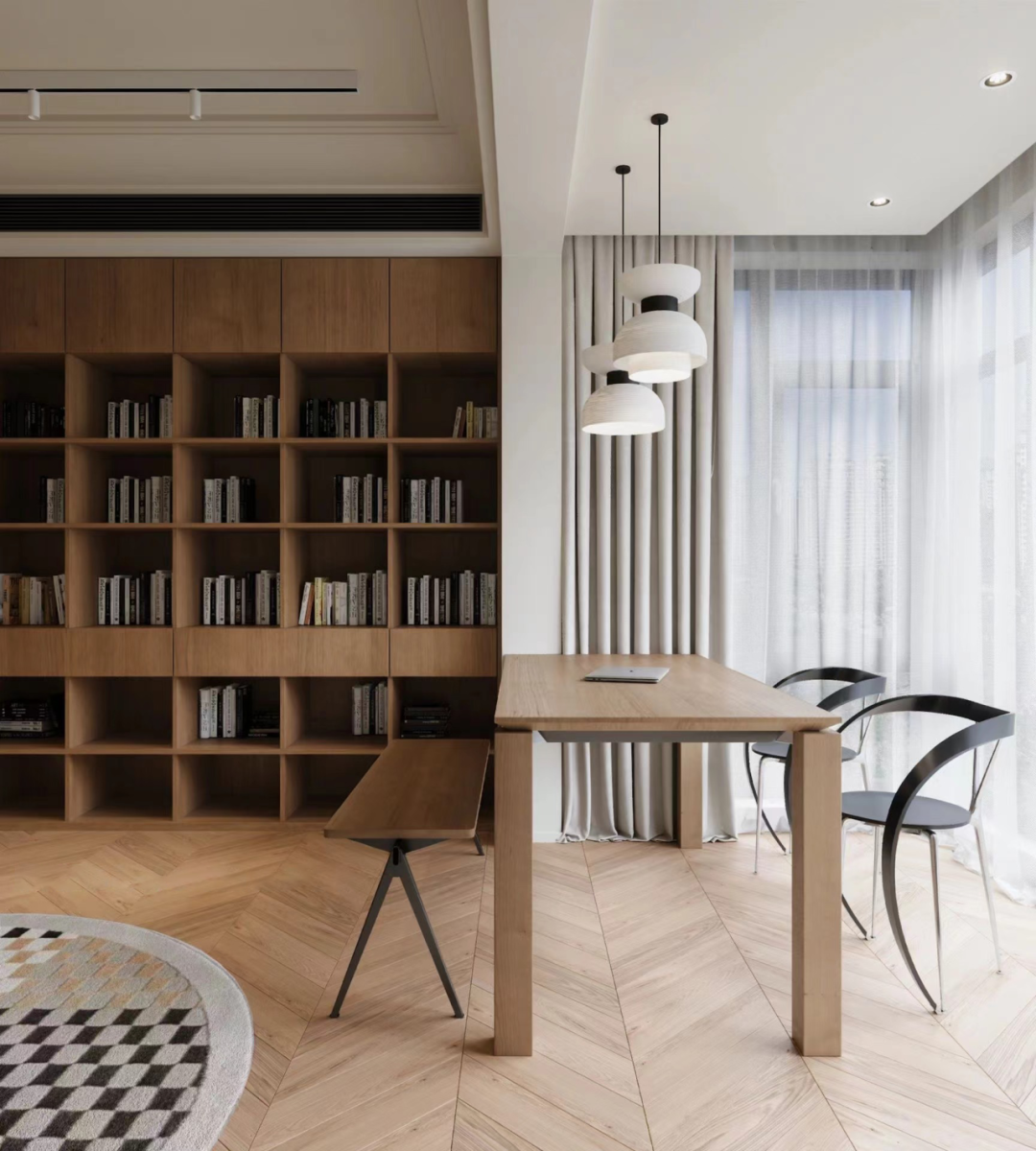 全收纳系统让客厅趋于变成了一个既能保证强收纳功能又能闲适阅读的开放学习区,将生活功能完美复合。