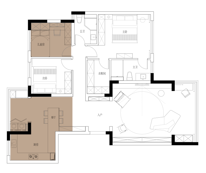 小朋友不断成长对公区的活动空间需求增加,同时需要独立的卧室来保证自己“小王国”的私密感;这期间家中老人也会偶尔来访帮忙照看小孩,有三代同堂的居住境况变化……