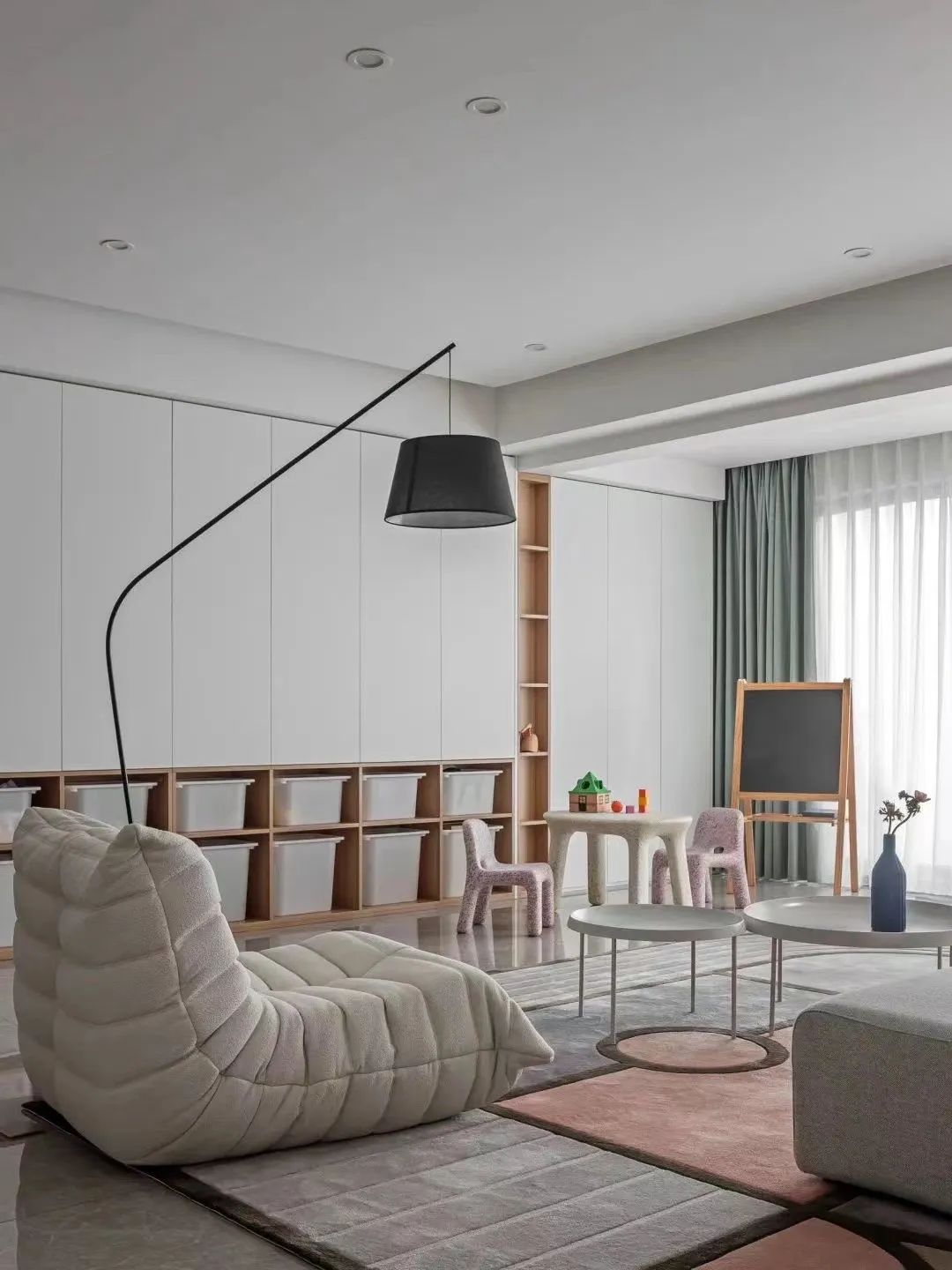 在保留客厅基本功能的基础上去掉多余物品,获得一个玩乐与成长并存,更适合亲子关系互动的潜力空间~