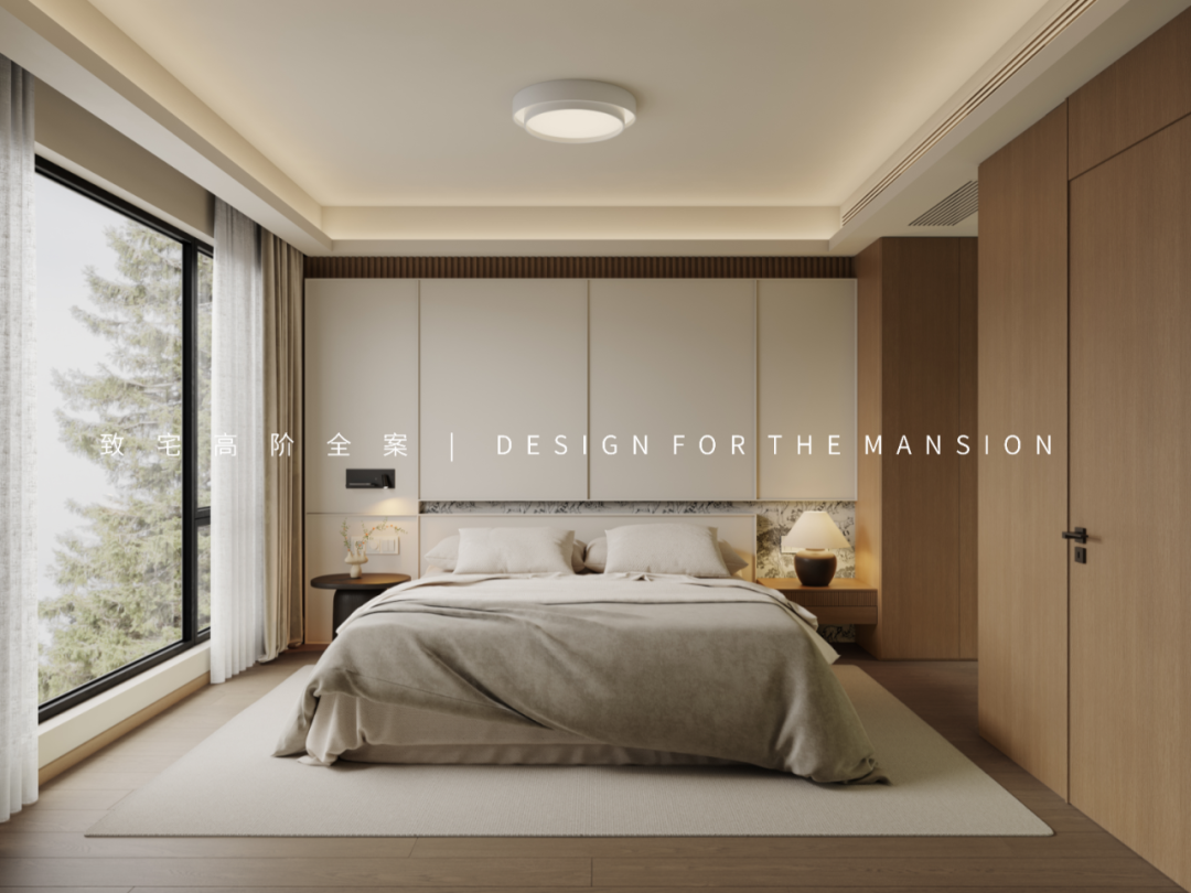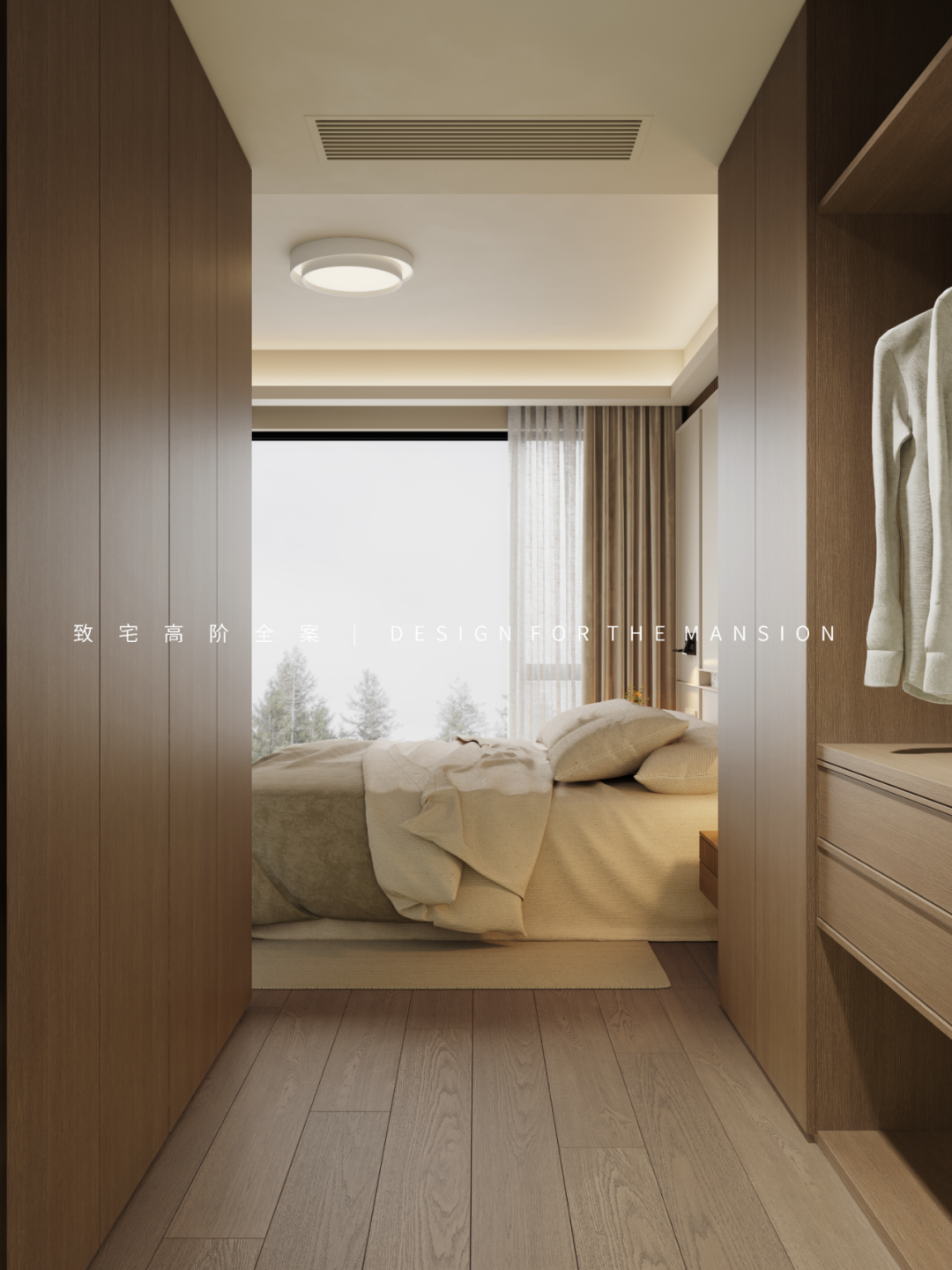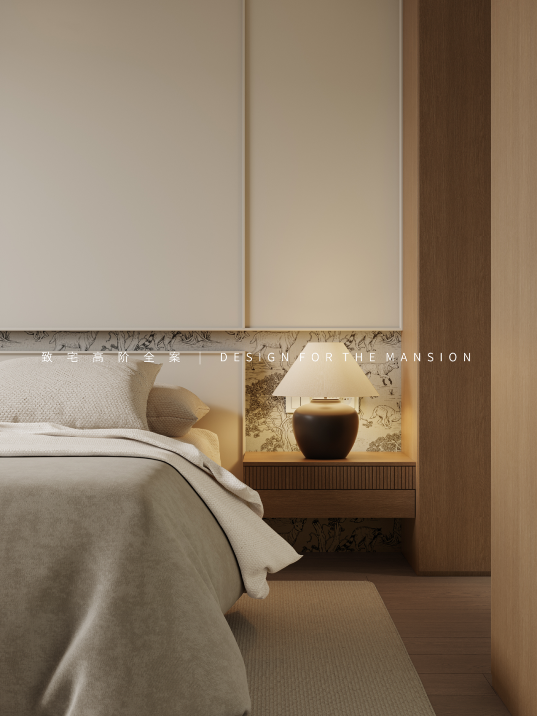 主卧空间主卧空间可以找到很多的眼熟元素。和屏风花纹一致的墙纸、始终贯穿全屋的骨骼线,全案设计把整体效果拿捏的非常到位。