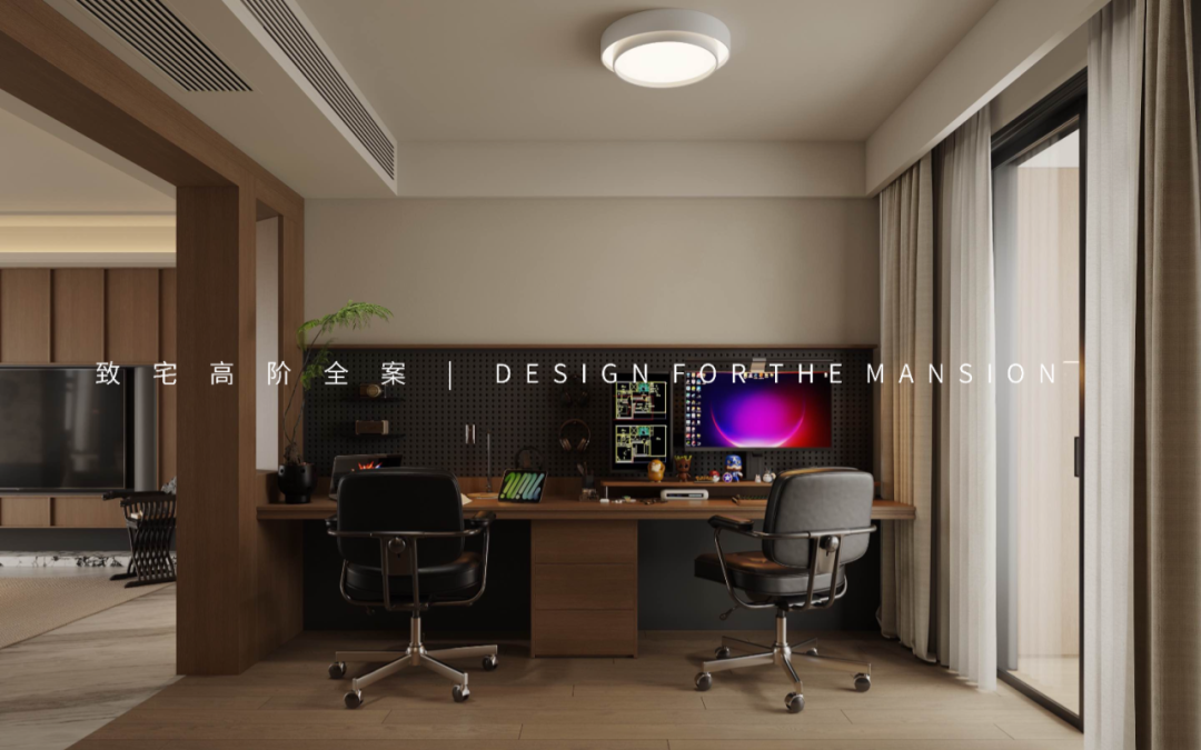 另外书房内部,足够双人使用的台面搭配满墙的洞洞板,与电视墙相呼应的书柜,竖板和层板突出不仅放大了柜立面的整体性,还扩大了整个空间的视觉效果。