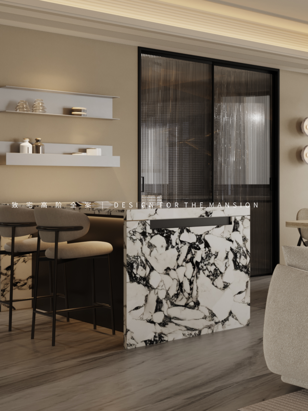 进入客厅空间,骨骼线造型与少量奢石将整个形态结构衬托的大胆又吸睛,这种处理手法在做空间分割提升视觉格调的同时,同时也解决了一部分客厅收纳需求。