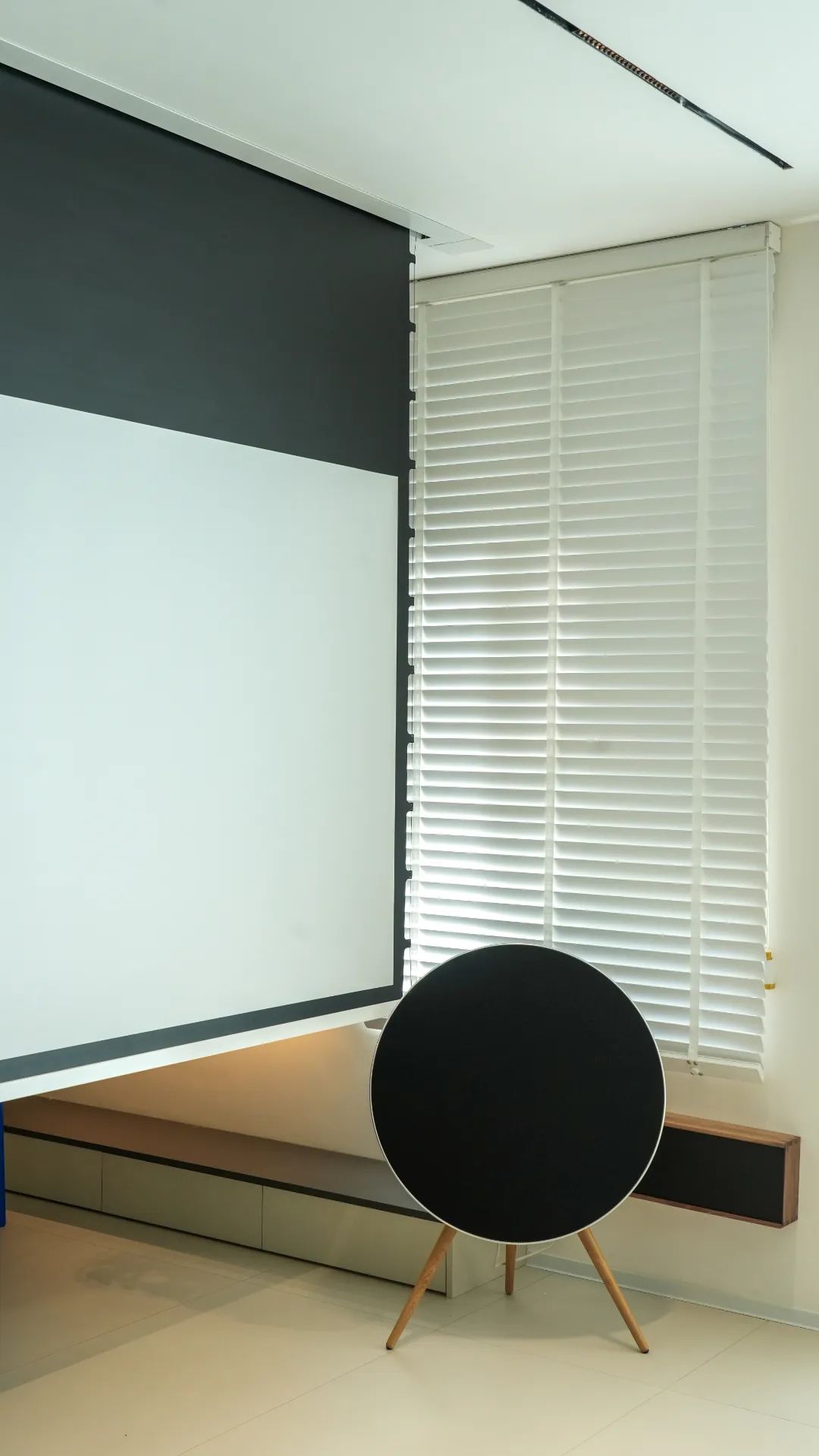 摒弃了传统的电视墙,与沙发位置做了对调。把我们的电视改为投影,利用顶部棚面将其内嵌包裹,让空间拥有更多的可能性。
