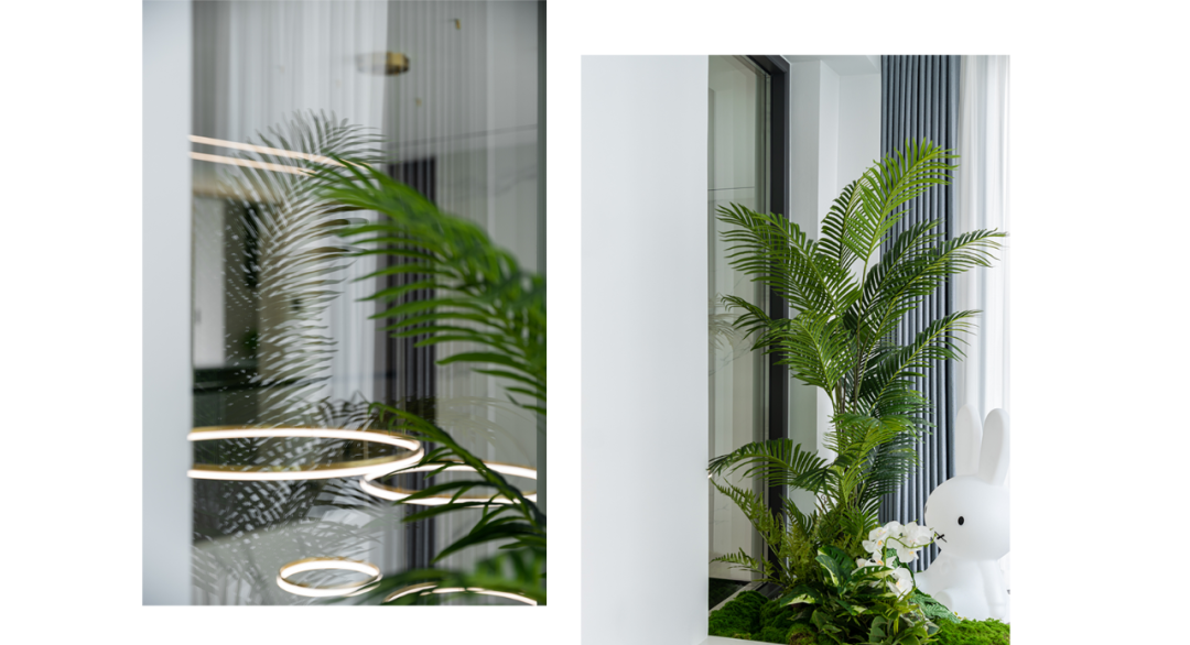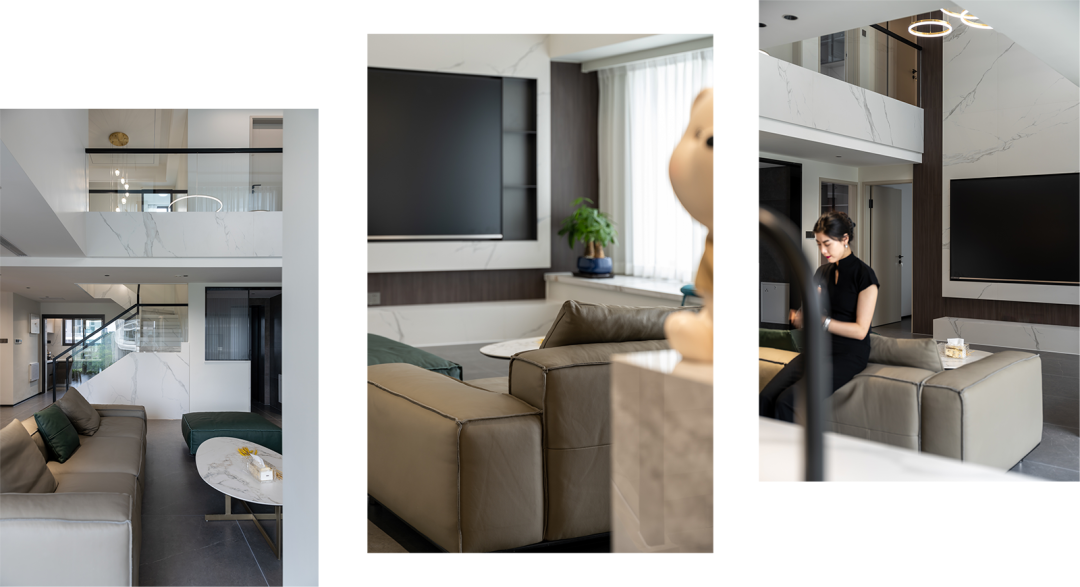 A fresh and elegant color scheme, the gray and wooden TV walls are simple yet aesthetically pleasing. More often than not, the choice is to leave white space and create an atmosphere with lighting.