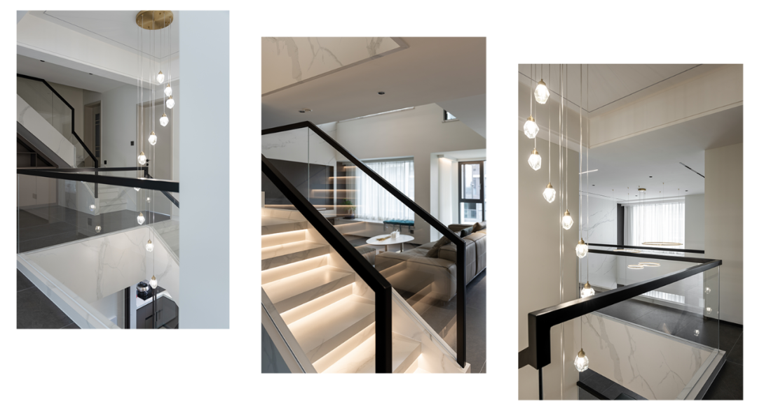 Without too many complex decorations, there is a chandelier at the head of the bed, with suspended storage cabinets on both sides. A suspended bed is used, and a storage desk is installed in the balcony area to meet office needs or serve as a dressing table, looking clean and comfortable.