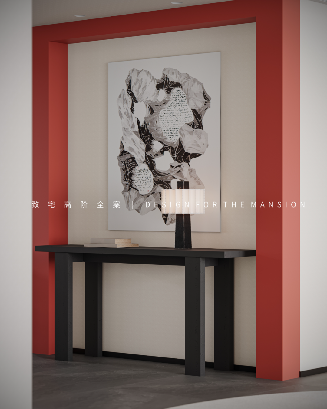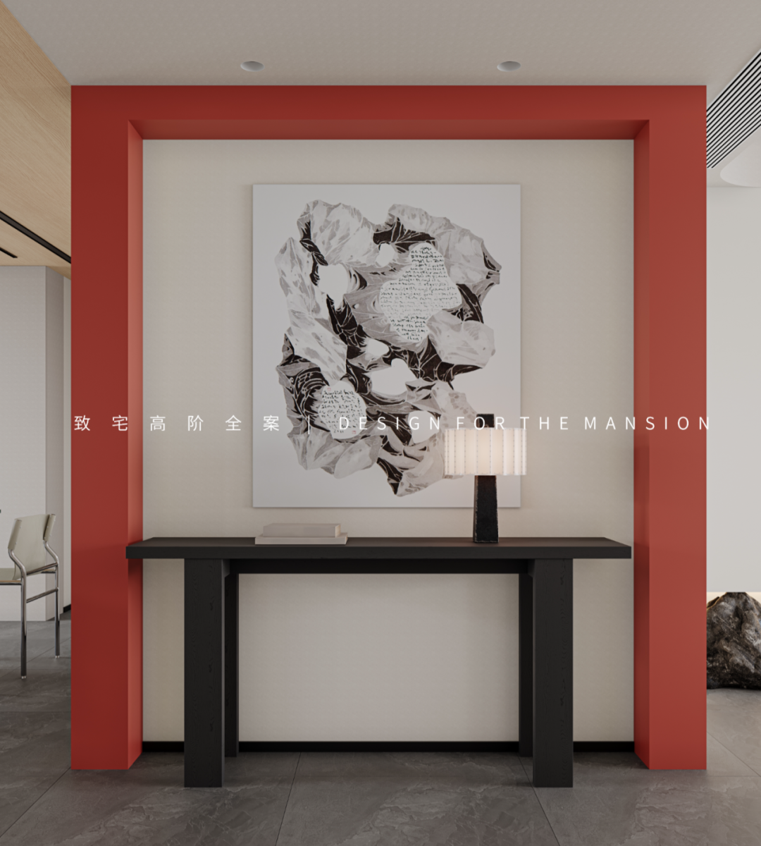 本案的玄关墙面更像是传统宅院中的回壁,是独属于一家人的归家仪式,红色框架将中式写意与留白表达得淋漓尽致。