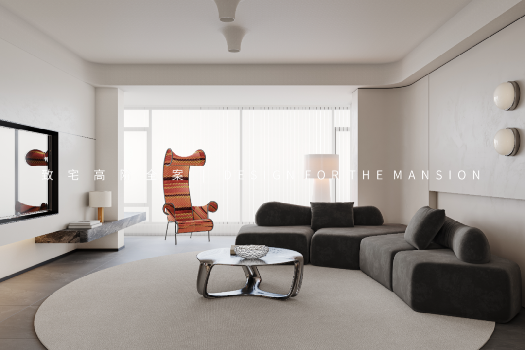 深灰色岩石沙发与带有莫比乌斯意味的茶几组合,呼应电视,成为整个空间的重色。