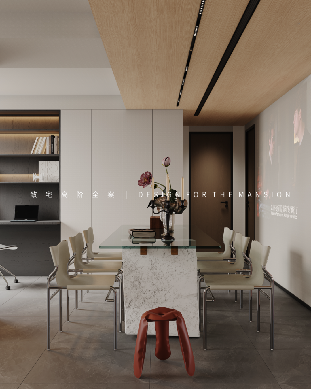 根据餐桌方形制作原木吊灯和隐形轨道灯,进一步增强纵向视觉拉伸,让空间更显整体和开敞。