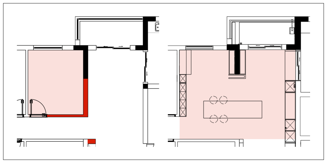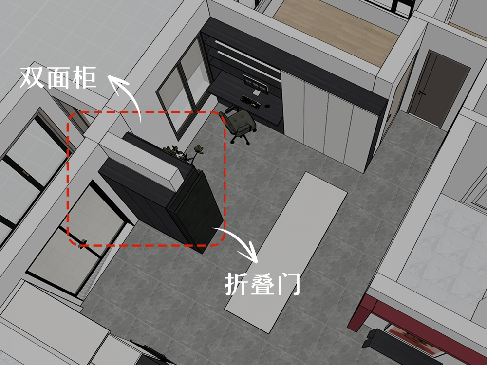 在餐桌旁,我们倚靠承重墙设置了双面收纳柜,并利用24墙体和两个柜体的宽度隐藏了一扇折叠门,给空间留有更多可能性。