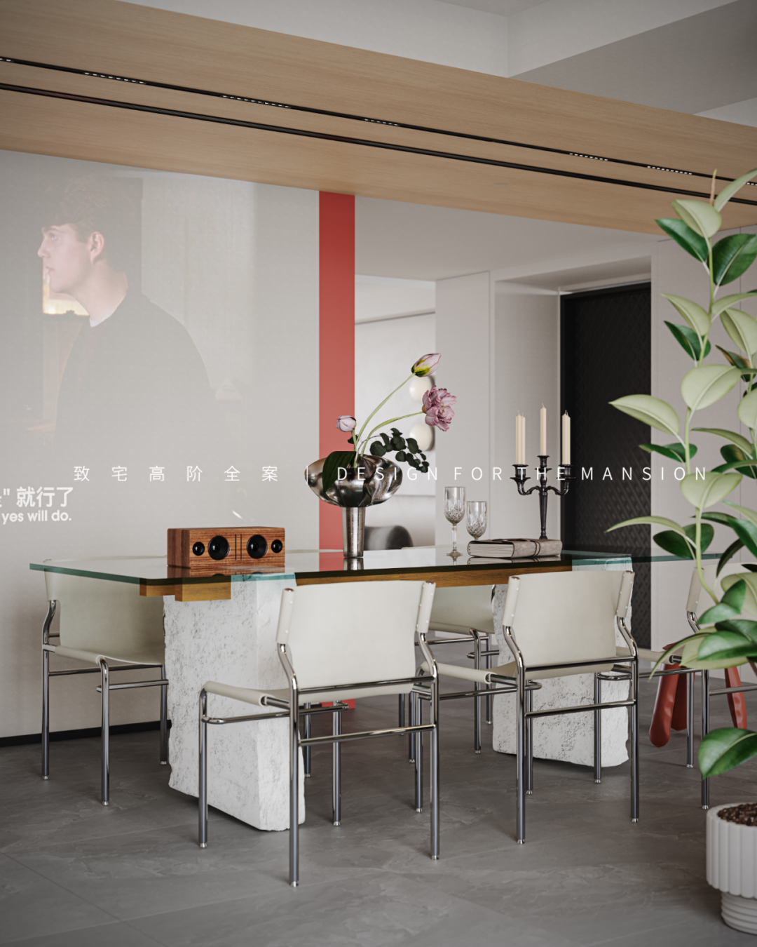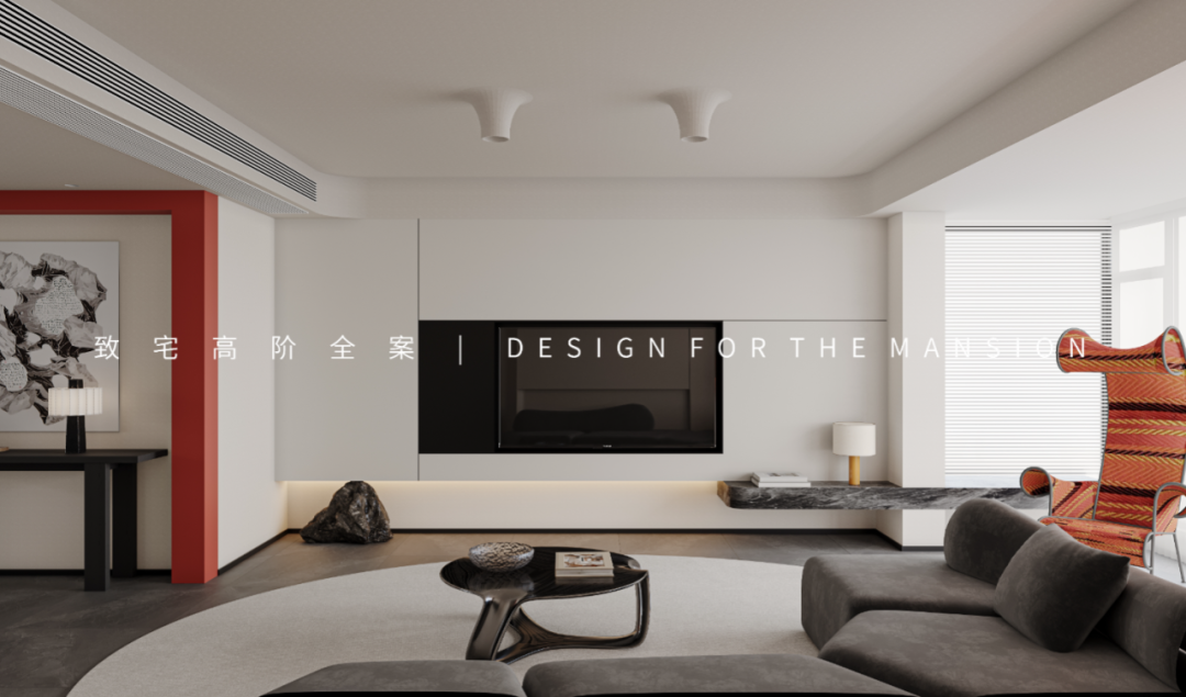 白色悬空电视墙,通过巧妙的板材切割方式,避免了大色块的枯燥。左侧使用「它山之石」作为造景,右侧则通过悬空石材将客厅与阳台贯通连接,以达到视觉上的平衡和空间整体性。