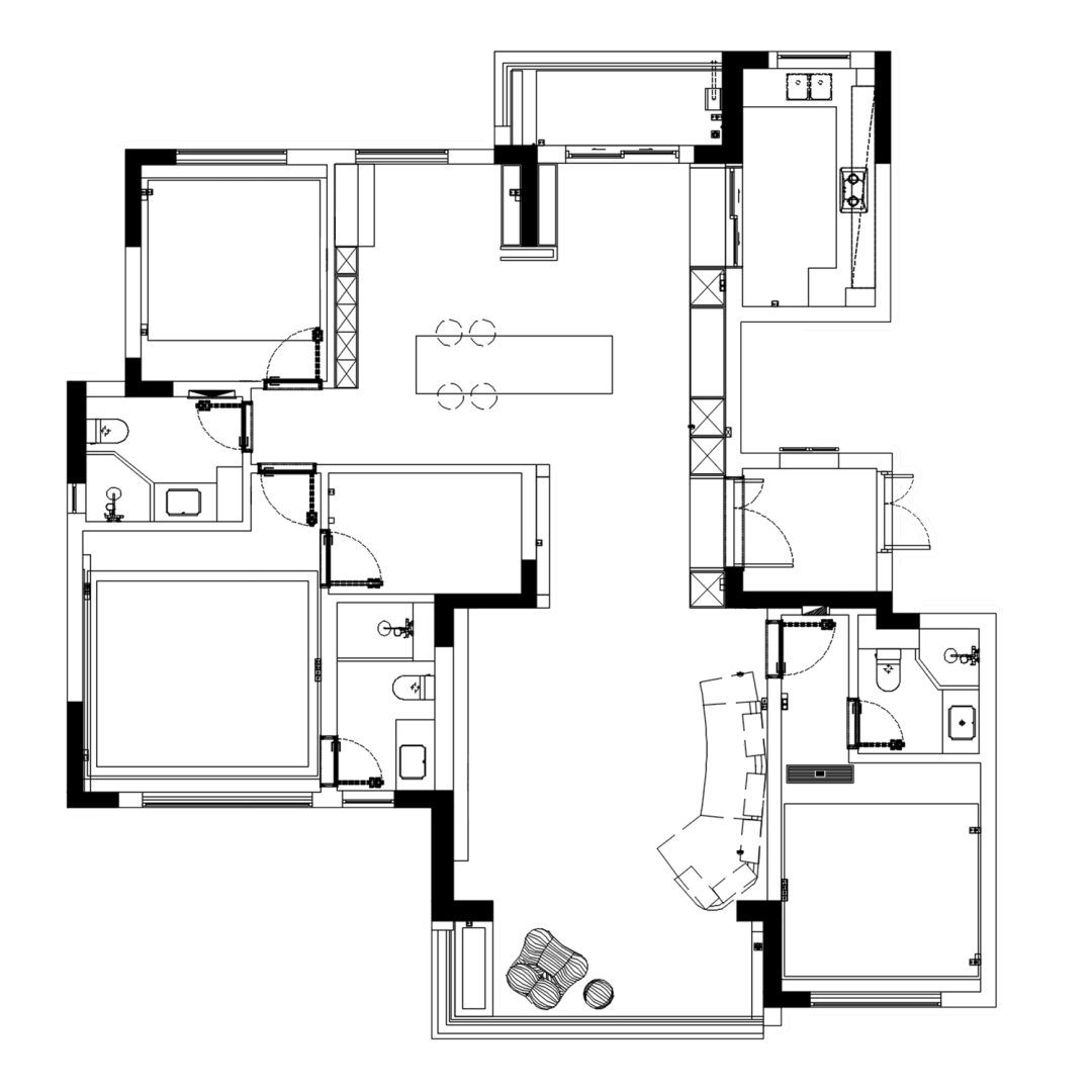 设计师通过简单的户型重构,在保留四室的同时,为餐厅「打开格局」。换个视角,会获得真正的改善和意想不到的精彩。