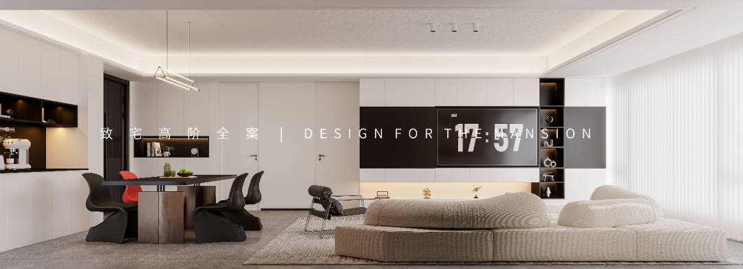 在另一版本的设计方案中,我们一改原始硬装和定制的木色与黑色,以白色作为空间主色调,让家具款式和风格重塑都具有更广的可选范围。