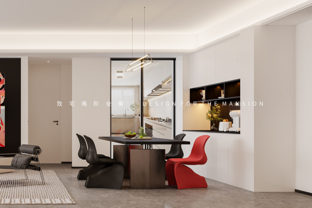 白色的餐边柜与点缀的黑色奢石让整体更具层次感,质地醇厚的黑,一处处落在白色的空间里,纯净而简洁。点缀色则使用热情的红,点燃家的生命力。