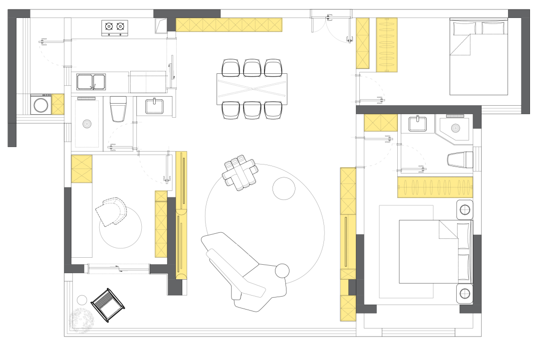 为了尽可能增加储物空间,且避免入户门正对沙发破坏私密性,我们拆除原本电视墙并与沙发墙调换位置,让电视墙与入户餐厅融为一体,增加了空间的包容性与开阔性。