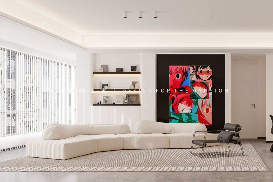 岩石沙发打破传统摆放方式,给予屋主更完整舒适的躺座体验。圆弧形包裹的沙发背景墙,散发出悠然气息,开放展示区域容纳屋主喜好,功能与颜值在这里共存。