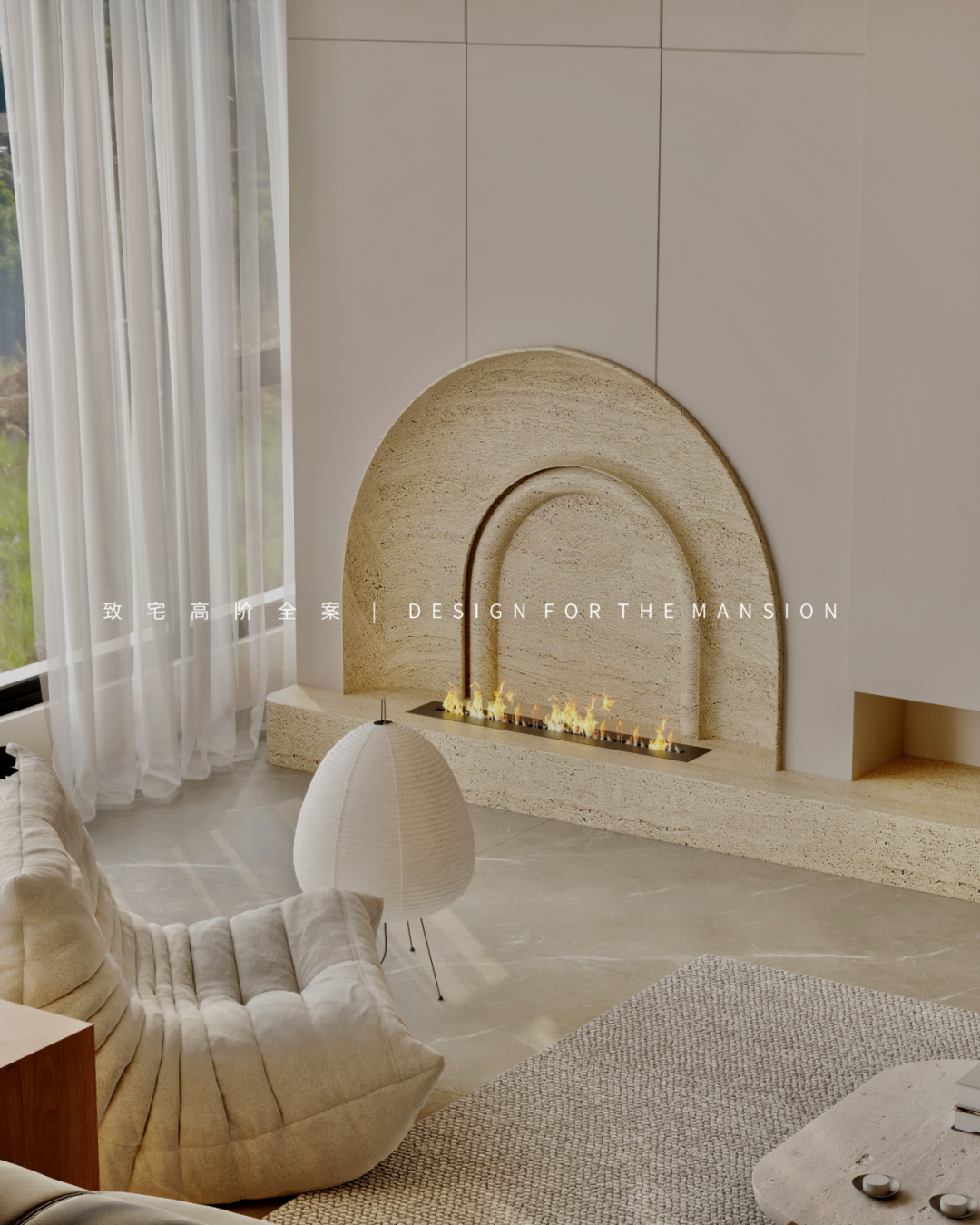 颇具装饰感的罗马柱延伸在天花板,搭配电视背景墙石洞样的小壁炉,一气呵成演绎着法式浪漫风情,格调拉满的同时又不显突兀。