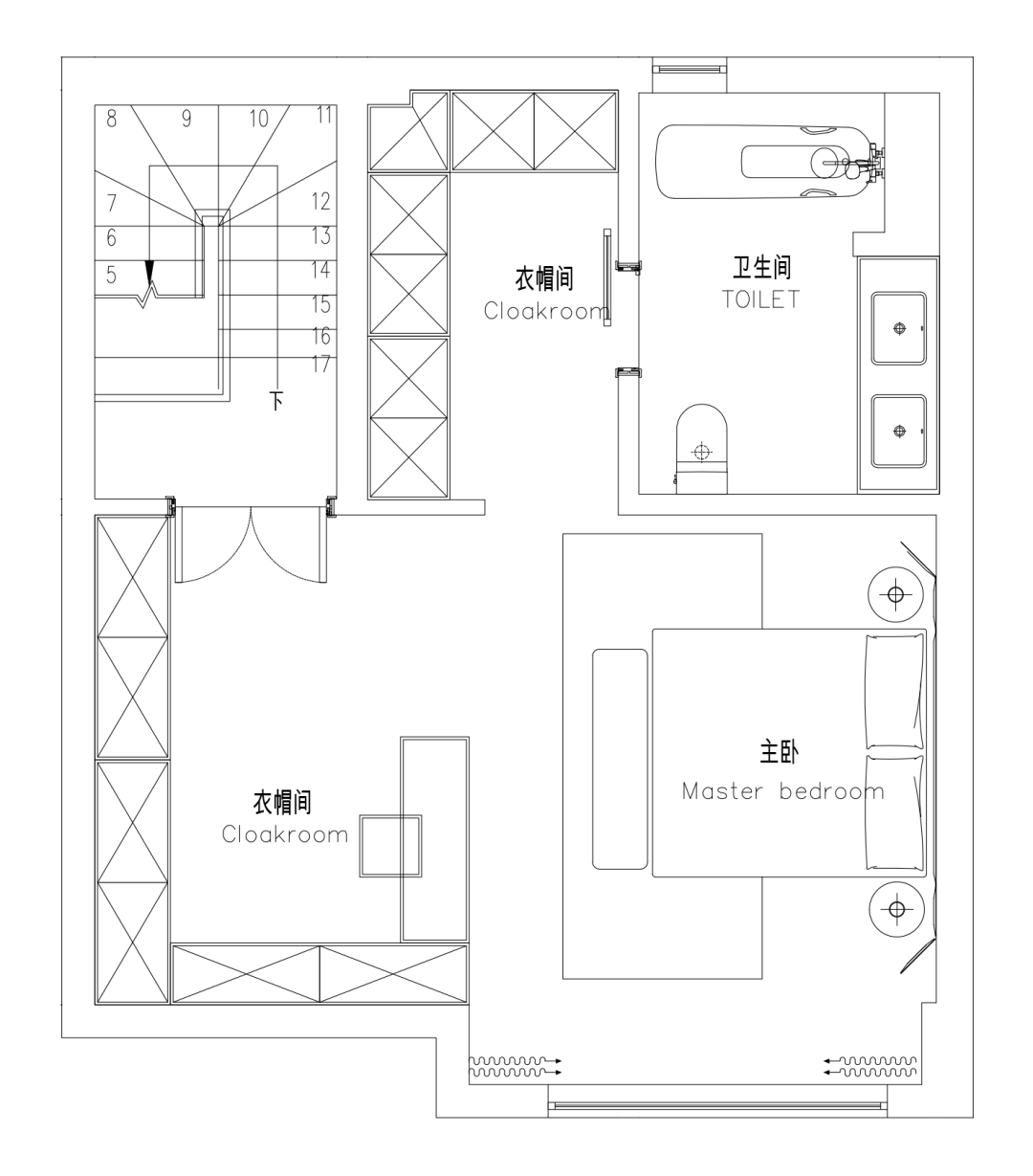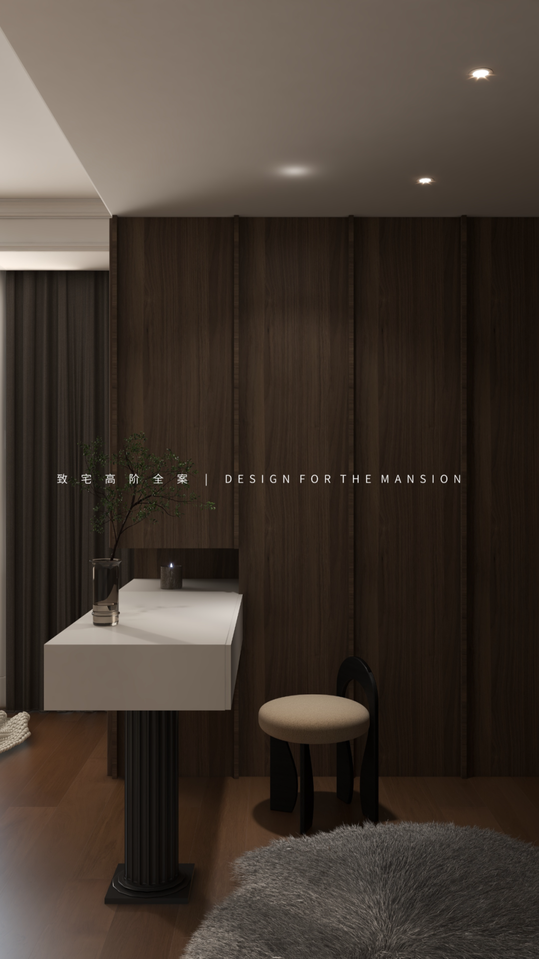 面积宽绰的卧室格局,让衣帽间有了容身之地,另外这里还增设了一个浪漫小吧台做隔断来区分两块功能区,精巧的设计被当作夜晚小酌、阅读的场所享受或作为女主人日常的梳妆台都是不错的选择~