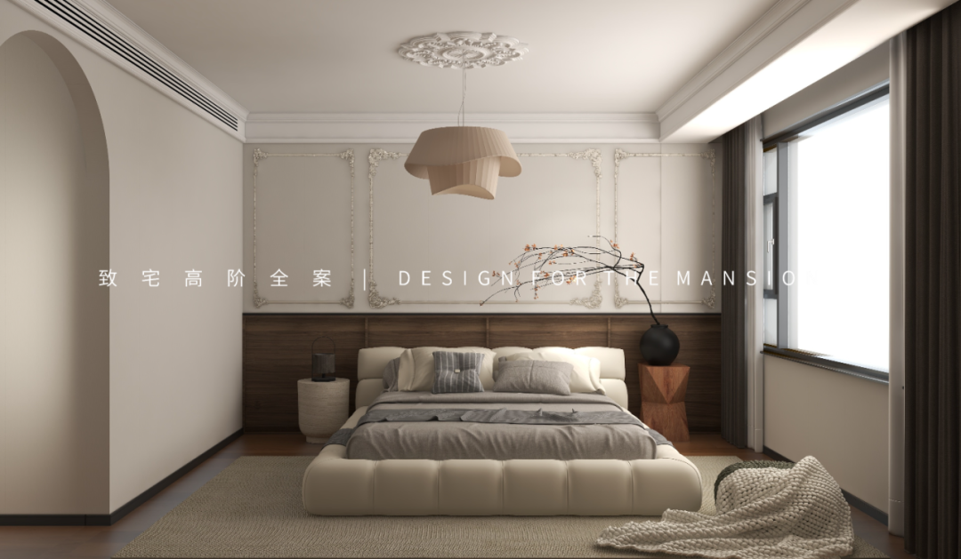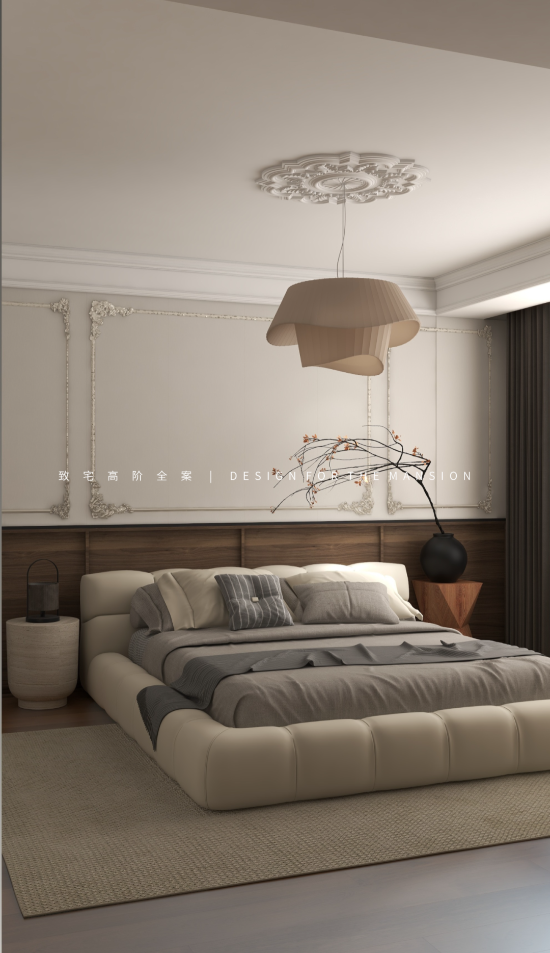 主卧犹如家中的秘境,是更为隐秘的地带,在色调和风格上更为浓郁。床体选择的是简洁的落地款式,无论是墙壁的雕花线条还是顶部的花盘设计,都为空间增添了法式情趣。