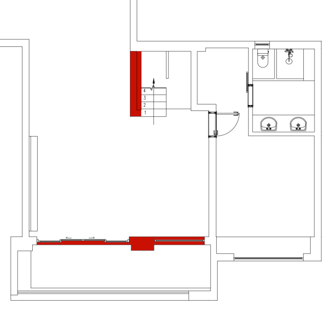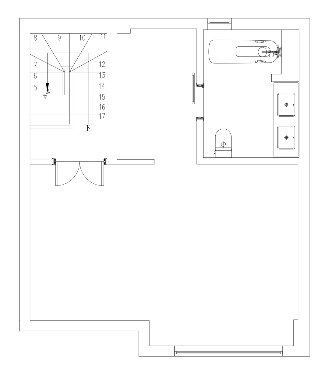 一旁连接二楼私区的楼梯处,我们拆除了侧墙和第一级梯步解决了原始楼梯空间面积浪费的问题,同时在楼梯下方还为家里的狗狗留出了一角休息区。