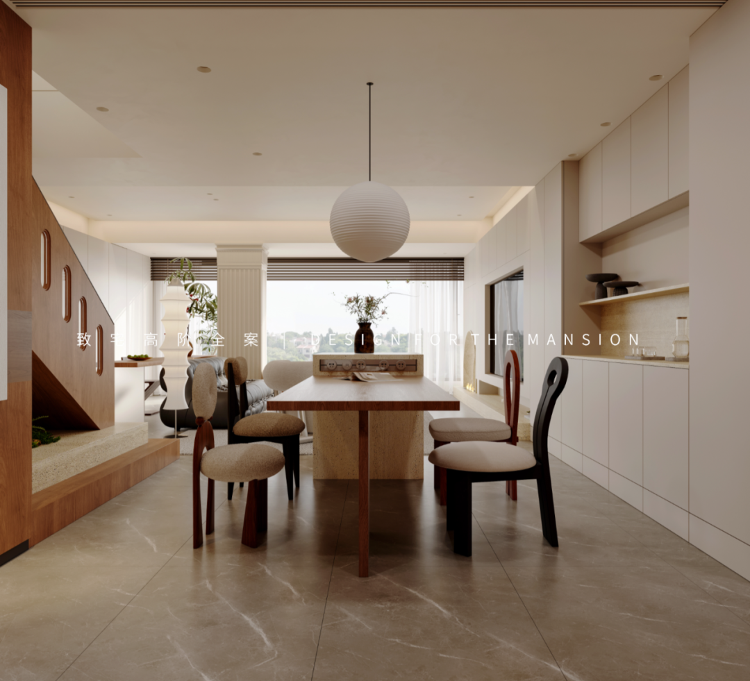 餐区实木质感餐桌与岛台组合形成了空间具有分量感的存在,造型各异的四把餐椅和球形吊灯,中和了整个区域的色彩与材质,避免了视觉失衡的问题。