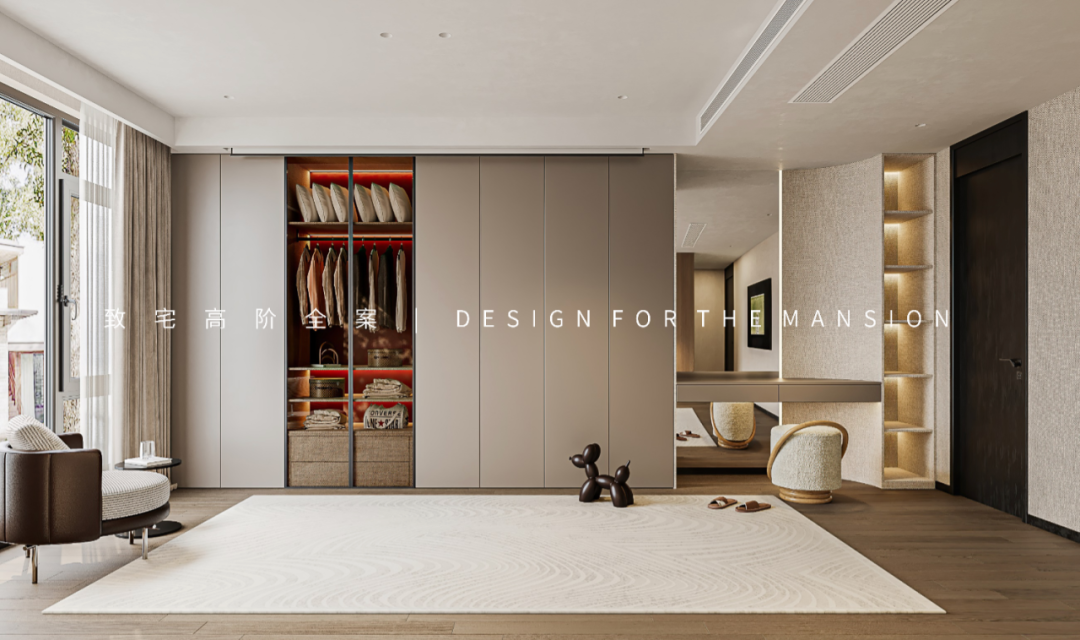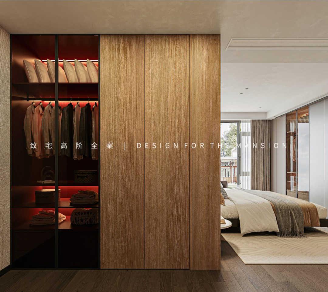 床尾设置满墙衣柜,一门到顶的隐藏收纳与展示收纳相结合,同时定制与梳妆柜一体化,满足卧室更多元化的使用功能。