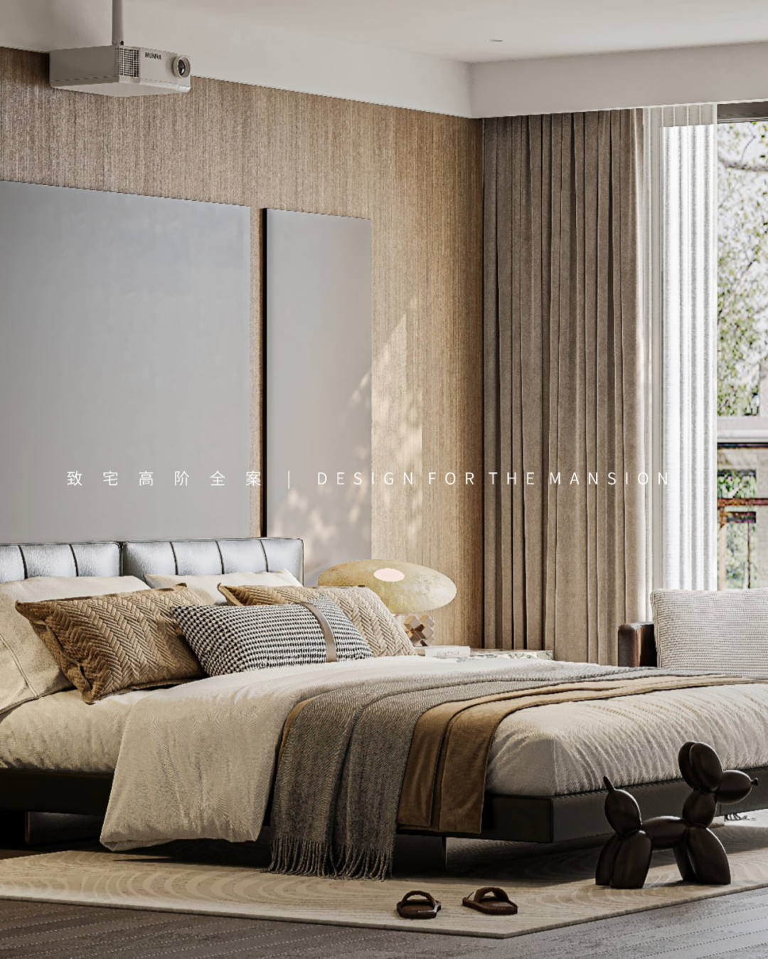 床头背景墙选择木色覆盖,形成视觉连贯,大大提升了空间质感,呈现出宁静与平和的舒适氛围。