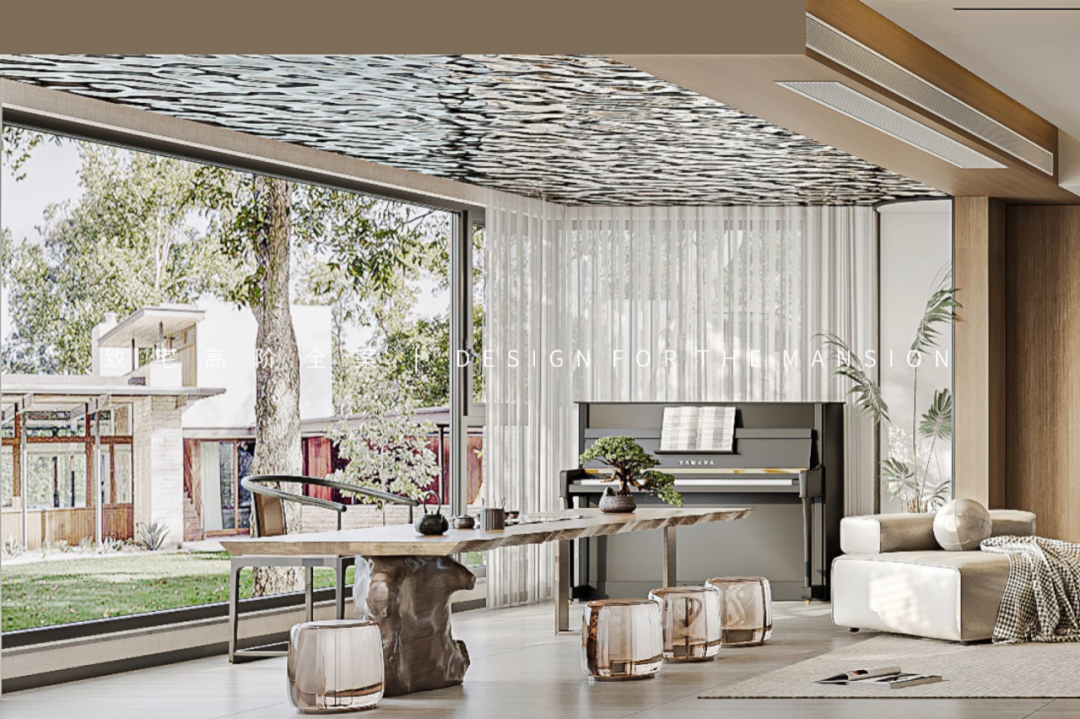 顶部的设计格外特别,木质元素与水波纹材质相呼应,在光线的折射下,波光粼粼,犹如海中波浪,下方摆放茶桌,闲来无事喝喝小茶,惬意生活。
