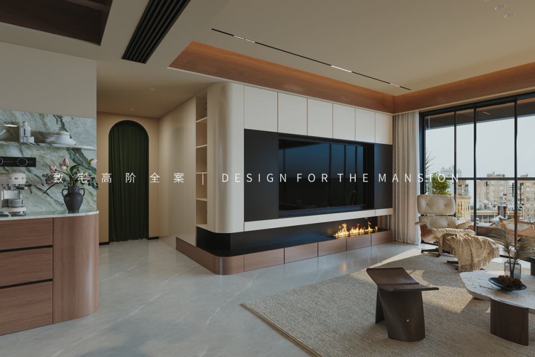 竖厅的布局没有将阳台纳入客厅,而是选择将电视墙与餐边柜当作一整面去设计布局,双弧转角连接的方式让公区有豁然开朗之感。
