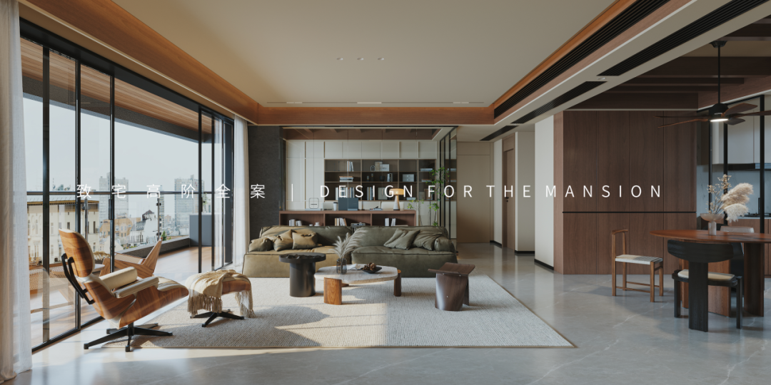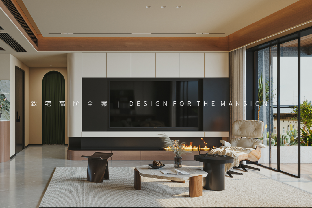 原本单调的吊顶空间增加了木饰面做装饰,而空调出风口为了视觉协调也替换成了黑色,再点缀上具有艺术造型的茶几、单椅和绿植,随手一拍都能捕捉到宛如电影画报的场景质感。
