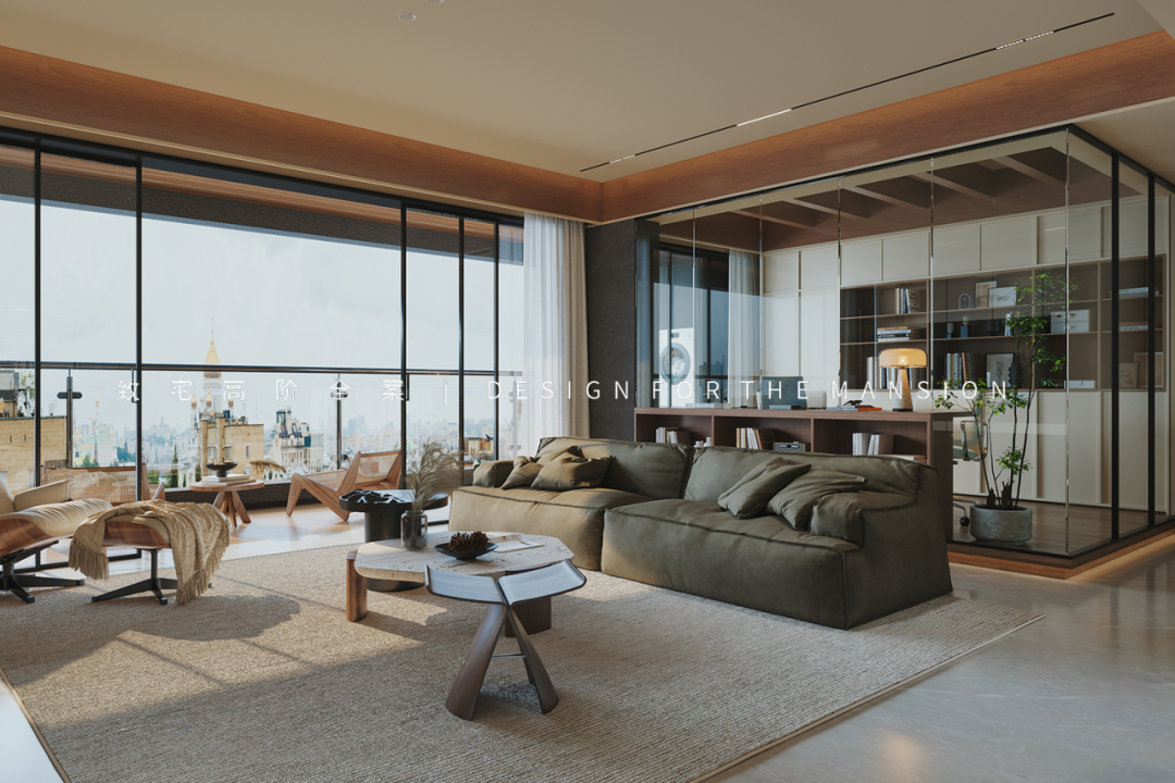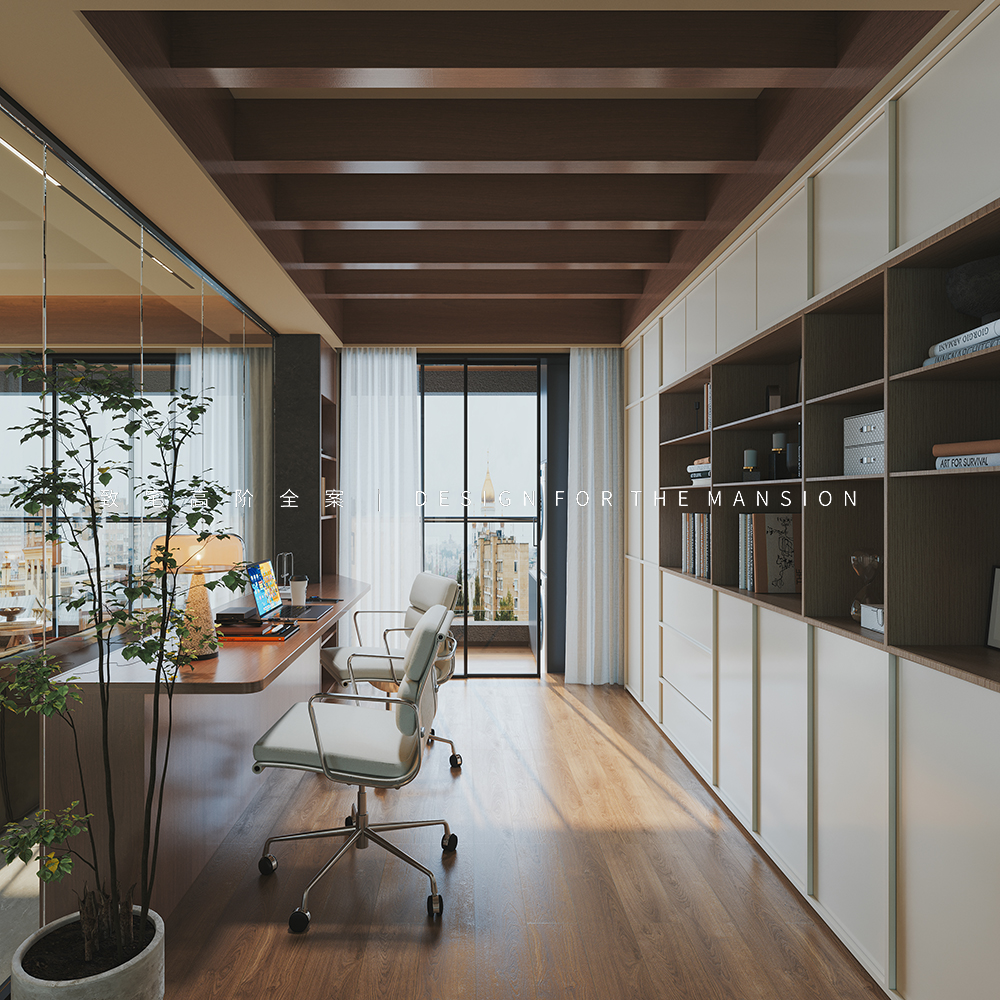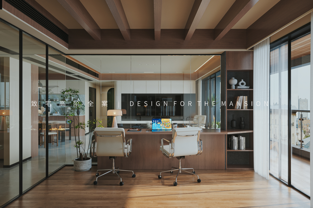 椅背后方一体到顶设计的骨骼线造型柜,在客厅外望去满墙的书籍和展示物更像是一面颜值墙,非常赏心悦目,而对书房来讲则是干净整洁的收纳柜,便于存放不常用的工具和文件。