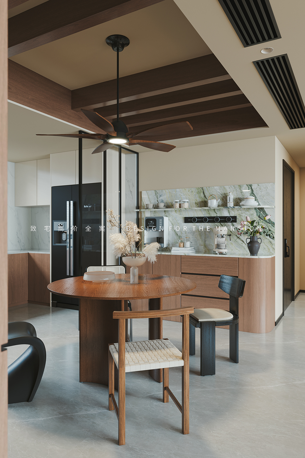 餐厅洄游动线中心选用了实木质的圆形餐桌,搭配造型独特的风扇灯和4把不同款式的混搭餐椅让这里充满了自然质朴又不失高级的视觉质感。