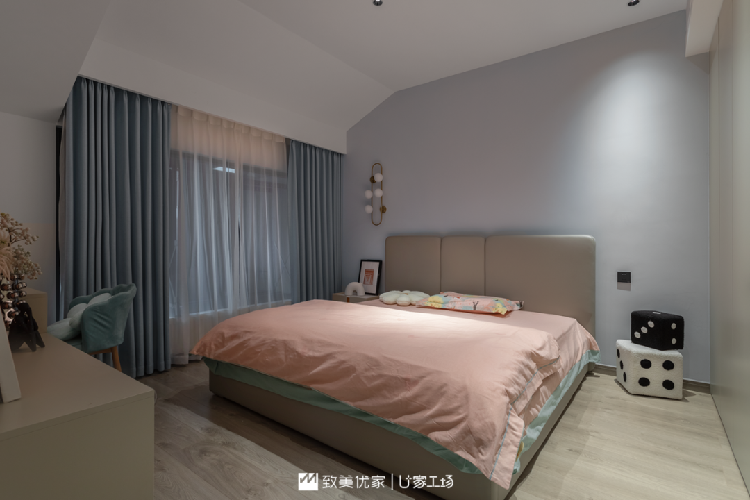 女孩房也是有趣的坡形屋顶,住在里面像是住在了哈利波特的魔法小屋里,改造后的房间比男孩房更大一些,布局相对更宽松,放下一张大床后,床尾还有足够宽的距离放置学习书桌,一侧还有一门到顶的整排衣柜,再多美丽的衣服都能装下。